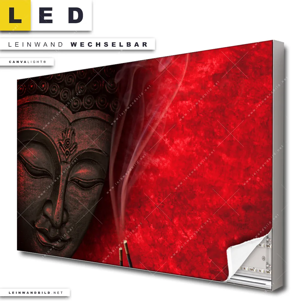 Du bist auf der Suche nach einem Buddha - Feng Shui LED Leinwandbild im Querformat? Begriffe wie Buddha, Buddhismus, Religion, Feng Shui, Zen, Meditation, Weihrauch haben Dich auf der Suche nach Deinem neuen XXL LED Wandbild mit wechselbarer Leinwand inspiriert? Farben wie Rot, Schwarz dürfen auf Deinem neuen breiten Leinwand-LED-Bild nicht fehlen und Leuchtbilder im Mixed Media, Modern Art Stil passen perfekt zu Deinem Einrichtungsstil?