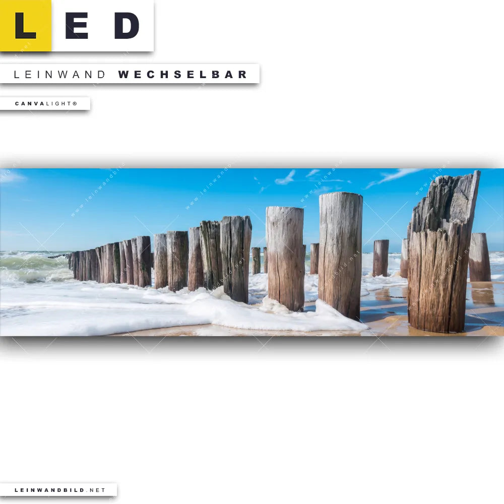 Du bist auf der Suche nach einem Strand - Meer, Landschaften LED Leinwandbild im Panorama-Format? Begriffe wie Sand, Deutschland, Wellenbrecher, Buhnen, Sommer, Ostsee - Nordsee, Urlaub - Reisen haben Dich auf der Suche nach Deinem neuen XXL LED Wandbild mit wechselbarer Leinwand inspiriert? Farben wie Blau, Beige, Braun dürfen auf Deinem neuen extra breiten Leinwand-LED-Bild nicht fehlen und Leuchtbilder im Natürlich - Realistisch Stil passen perfekt zu Deinem Einrichtungsstil?