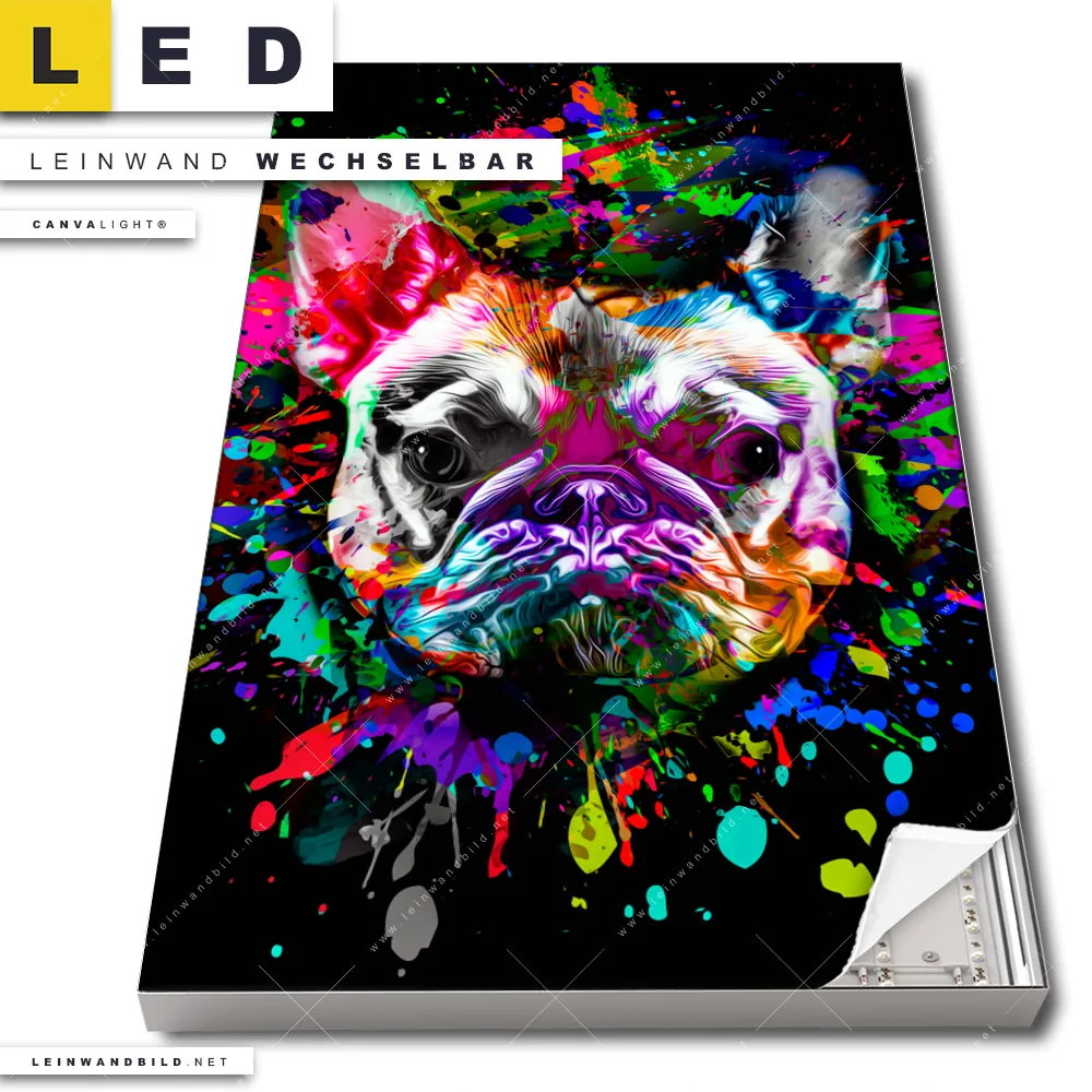 LED Leinwandbild Canvalight® TEX | Bunte Bulldogge Schwarz | Hochformat