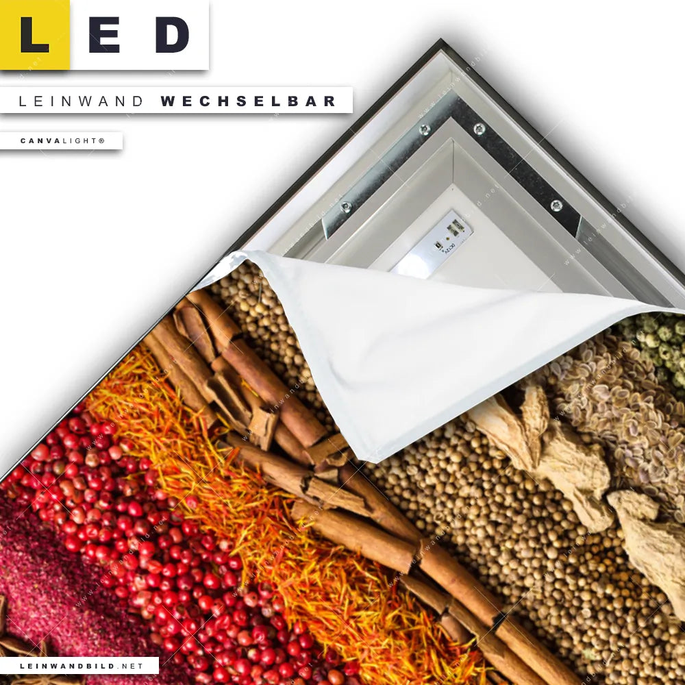 Du bist auf der Suche nach einem Essen - Trinken LED Leinwandbild im Querformat? Begriffe wie Gewürze, Kräuter, kochen, Chili, Pfeffer, Paprika, Lebensmittel, Ernährung, Essen, Zimt, Vanille haben Dich auf der Suche nach Deinem neuen XXL LED Wandbild mit wechselbarer Leinwand inspiriert? Farben wie Bunt dürfen auf Deinem neuen breiten Leinwand-LED-Bild nicht fehlen und Leuchtbilder im Modern Art, Natürlich - Realistisch Stil passen perfekt zu Deinem Einrichtungsstil?