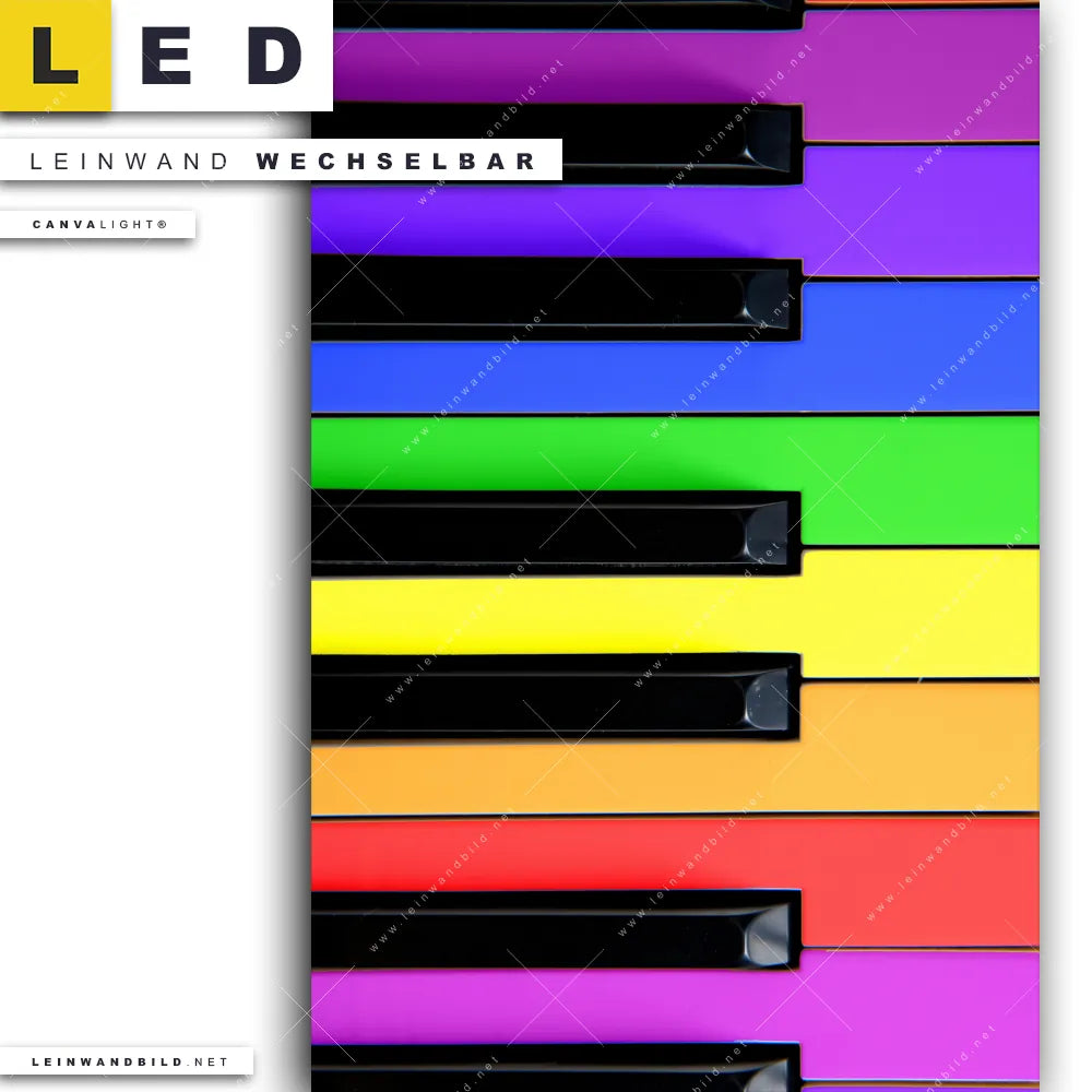 Dann sollte das LED Leinwandbild Canvalight® TEX | Bunte Klaviertasten | Hochformat den Weg zu Dir finden. Das stufenlos dimmbare Leinwandbild Tasten Klavier in Regenbogenfarben im steckerfertigen Leuchtrahmen mit Fernbedienung und optionaler Farbtemperatursteuerung fügt sich als Eye-Catcher harmonisch in jedes Wohnzimmer - Schlafzimmer, Kinderzimmer, Bar - Gastronomie Raumkonzept ein.