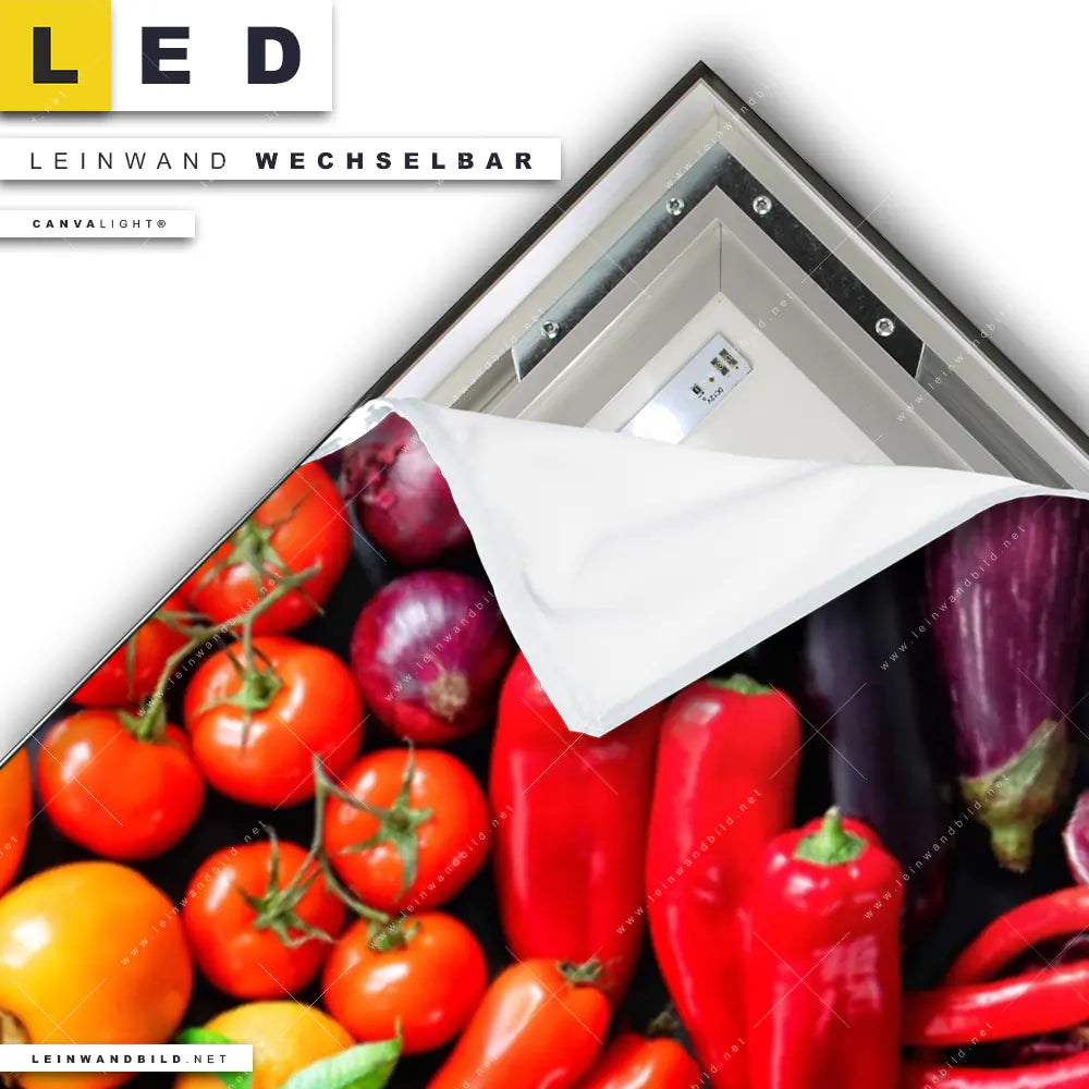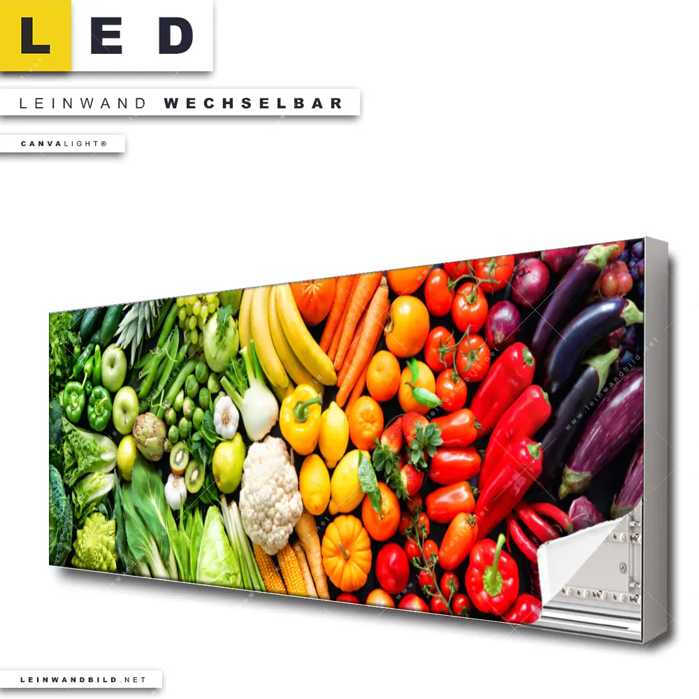 Du bist auf der Suche nach einem Essen - Trinken LED Leinwandbild im Panorama-Format? Begriffe wie Gemüse, Essen, gesund, Nahrung, Lebensmittel, Ernährung, Küche, Kochen, Gesundheit, Obst, Früchte haben Dich auf der Suche nach Deinem neuen XXL LED Wandbild mit wechselbarer Leinwand inspiriert? Farben wie Grün, Hellgrün, Lila, Rot, Orange, Gelb dürfen auf Deinem neuen extra breiten Leinwand-LED-Bild nicht fehlen und Leuchtbilder im Natürlich - Realistisch Stil passen perfekt zu Deinem Einrichtungsstil?