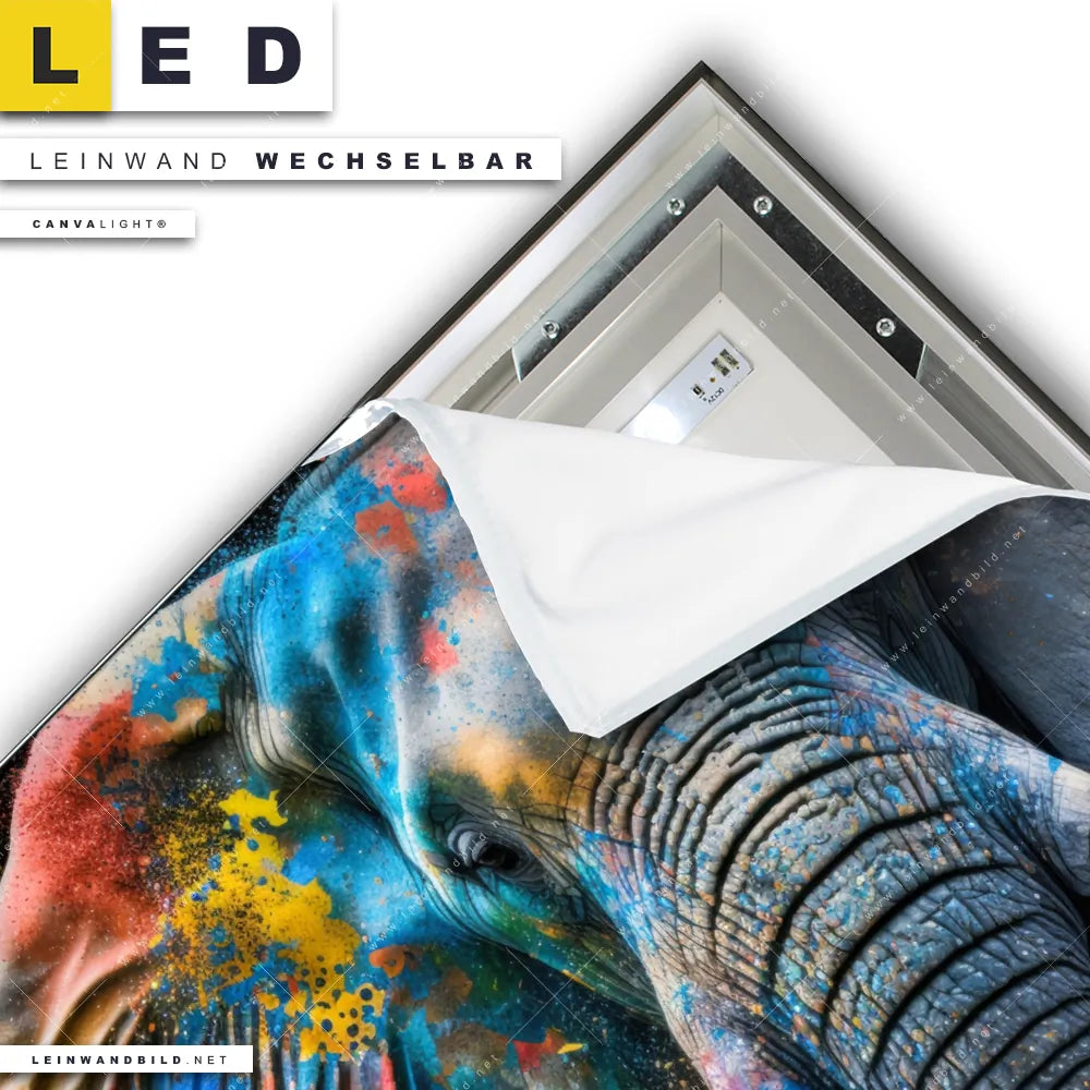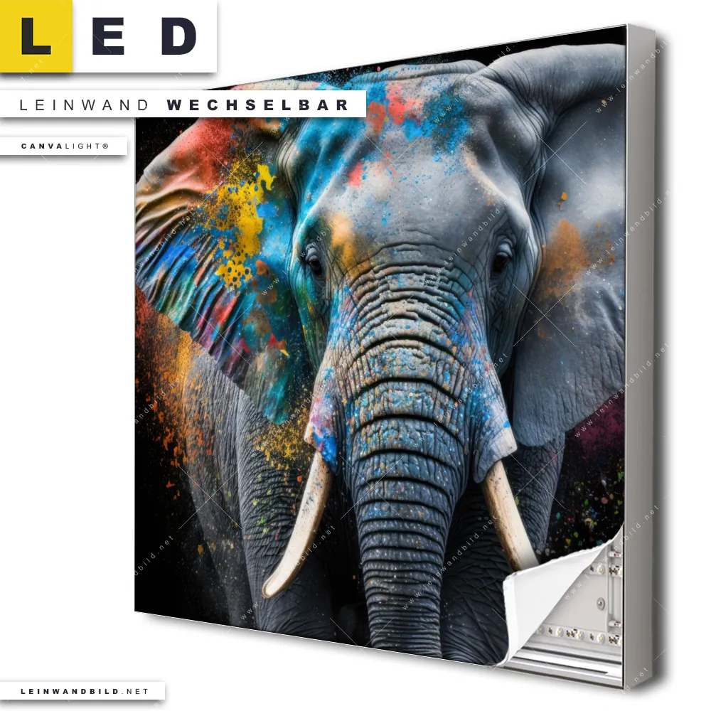 Du konfigurierst Dein individuelles LED Leinwandbild Canvalight® TEX | Bunter Elefant | Quadrat und wir produzieren es NEU für Dich. Unsere Tierwelt LED Bilder mit wechselbarer Textil-Leinwand sind KEINE Lagerware. Du bist Dir unsicher, welches Motiv oder Format das richtige für dein individuelles Canvalight® Leuchtbild ist, dann helfen wir dir gerne weiter und beraten dich!