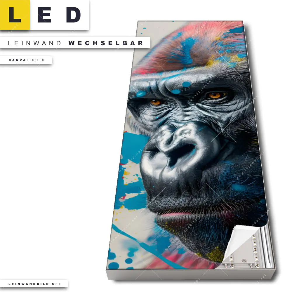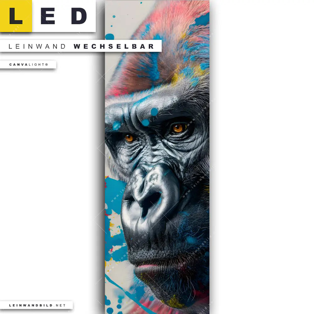LED Leinwandbild Canvalight® TEX | Bunter Gorilla mit Farbspritzern | Schmal