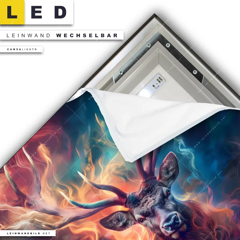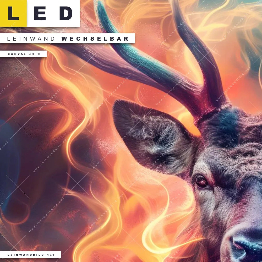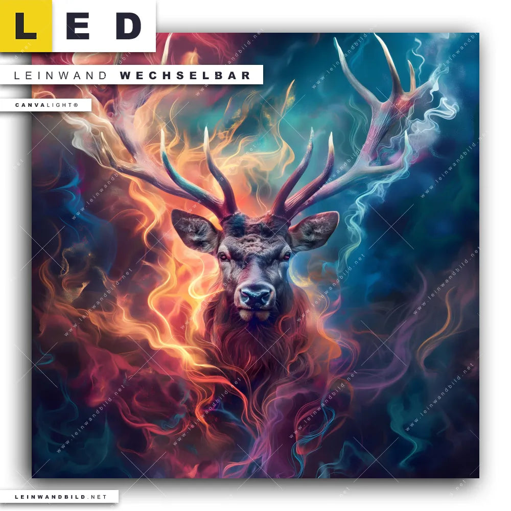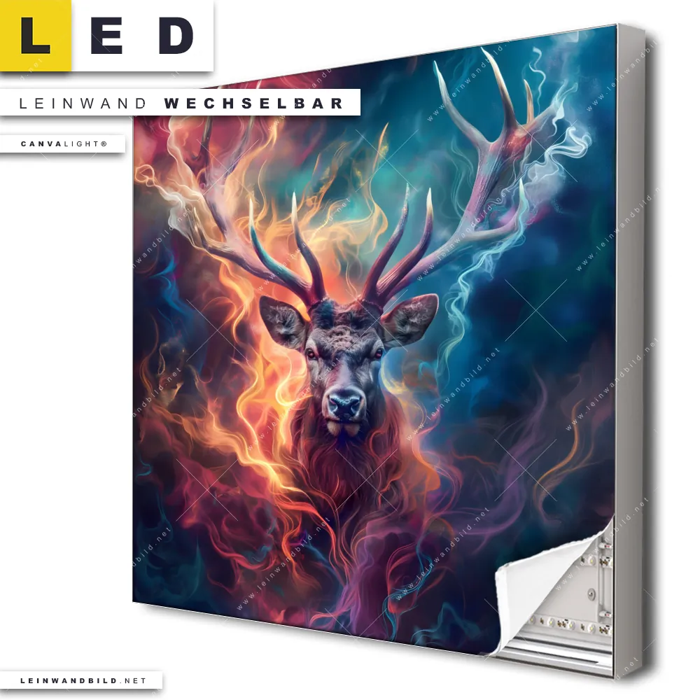 LED Leinwandbild Canvalight® TEX | Bunter Hirsch in Flammen | Quadrat