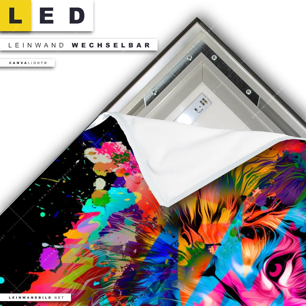 Du konfigurierst Dein individuelles LED Leinwandbild Canvalight® TEX | Bunter Löwe Schwarz | Hochformat und wir produzieren es NEU für Dich. Unsere Tierwelt LED Bilder mit wechselbarer Textil-Leinwand sind KEINE Lagerware. Du bist Dir unsicher, welches Motiv oder Format das richtige für dein individuelles Canvalight® Leuchtbild ist, dann helfen wir dir gerne weiter und beraten dich!