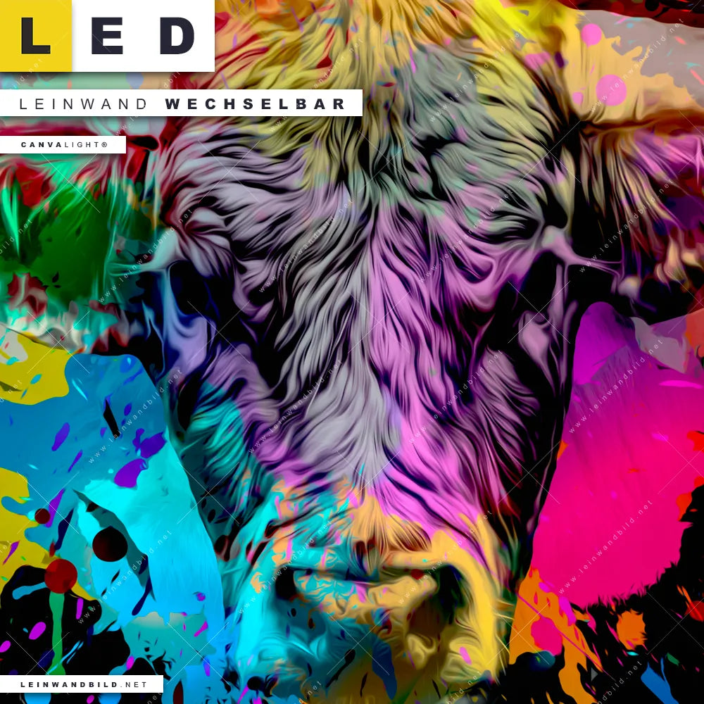 Du bist auf der Suche nach einem Tierwelt LED Leinwandbild im Querformat? Begriffe wie Tier, Stier, Hochlandkuh, Highlander, Büffel, Splash, Farbspritzer, Rind haben Dich auf der Suche nach Deinem neuen XXL LED Wandbild mit wechselbarer Leinwand inspiriert? Farben wie Bunt, Schwarz dürfen auf Deinem neuen breiten Leinwand-LED-Bild nicht fehlen und Leuchtbilder im Abstrakt, Modern Art, Pop Art Stil passen perfekt zu Deinem Einrichtungsstil?