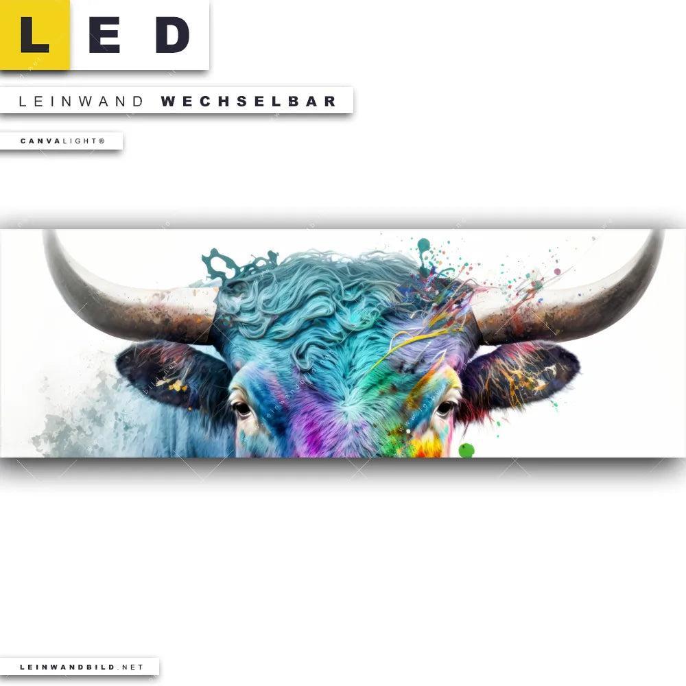 LED Leinwandbild Canvalight® TEX | Bunter Stierkopf | Panorama