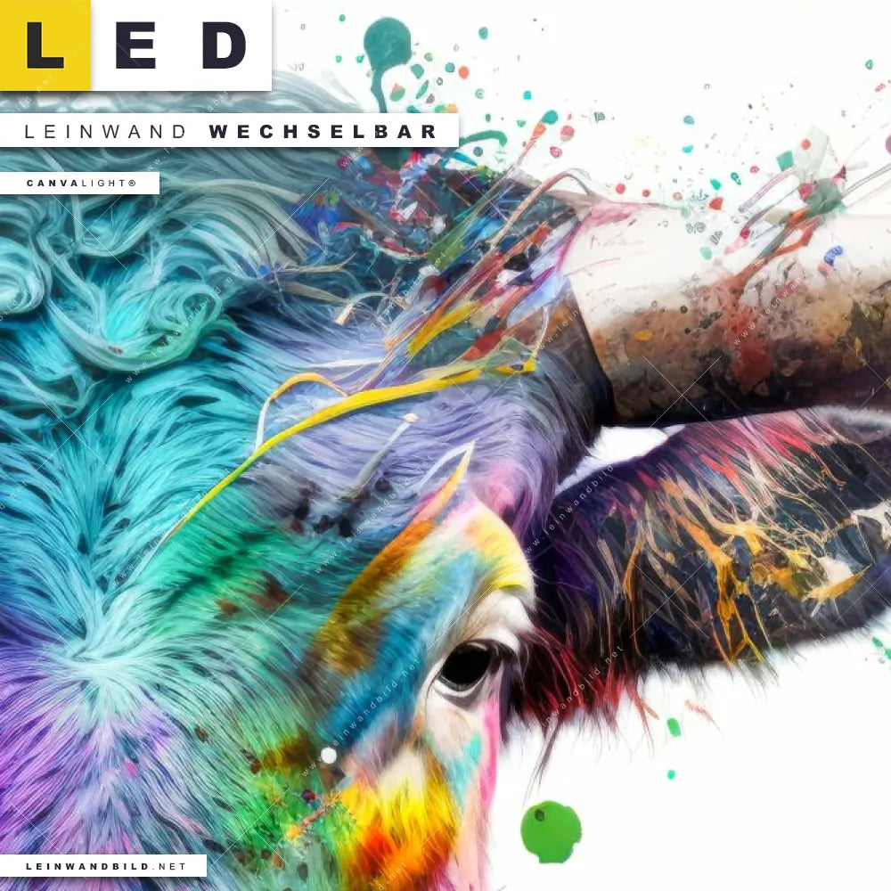 Dann sollte das LED Leinwandbild Canvalight® TEX | Bunter Stierkopf | Panorama den Weg zu Dir finden. Das stufenlos dimmbare Leinwandbild Kuhkopf mit Spritzern von Farbe im steckerfertigen Leuchtrahmen mit Fernbedienung und optionaler Farbtemperatursteuerung fügt sich als Eye-Catcher harmonisch in jedes Bar - Gastronomie, Wohnzimmer - Schlafzimmer, Flur - Eingangsbereich, Büro - Kanzlei Raumkonzept ein.