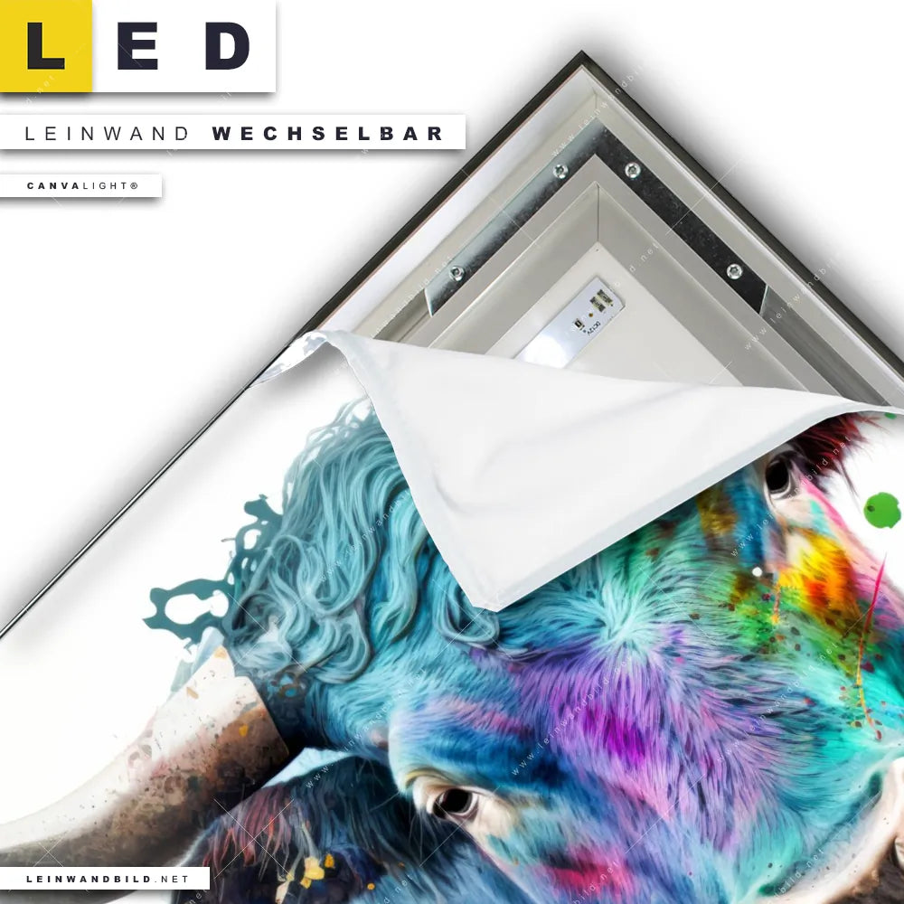 Du konfigurierst Dein individuelles LED Leinwandbild Canvalight® TEX | Bunter Stierkopf | Quadrat und wir produzieren es NEU für Dich. Unsere Tierwelt LED Bilder mit wechselbarer Textil-Leinwand sind KEINE Lagerware. Du bist Dir unsicher, welches Motiv oder Format das richtige für dein individuelles Canvalight® Leuchtbild ist, dann helfen wir dir gerne weiter und beraten dich!