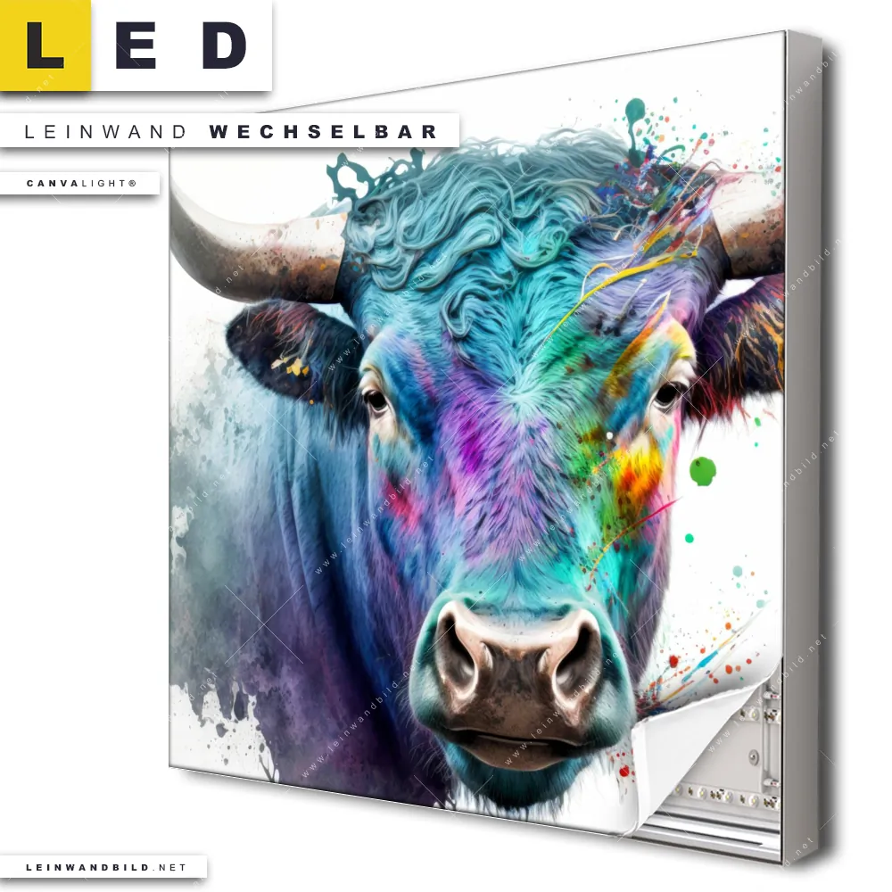 Du bist auf der Suche nach einem Tierwelt LED Leinwandbild im Quadratischen Format? Begriffe wie Tier, Stier, Hochlandkuh, Büffel, Farbspritzer, Rind, Bulle, Farbe haben Dich auf der Suche nach Deinem neuen XXL LED Wandbild mit wechselbarer Leinwand inspiriert? Farben wie Weiss, Lila, Türkis dürfen auf Deinem neuen Leinwand-LED-Bild nicht fehlen und Leuchtbilder im Modern Art, Pop Art Stil passen perfekt zu Deinem Einrichtungsstil?