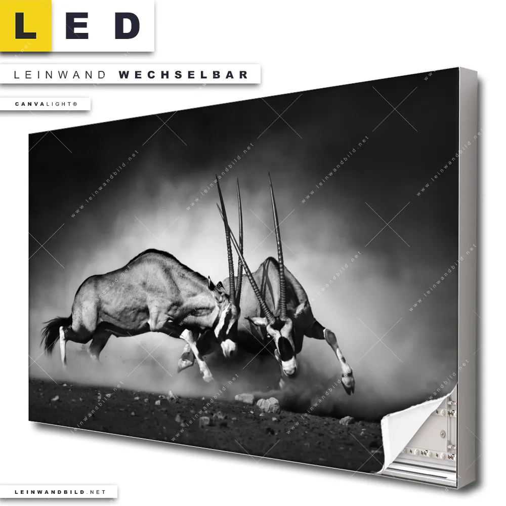 Du bist auf der Suche nach einem Tierwelt LED Leinwandbild im Querformat? Begriffe wie Afrika, wild, Safari, Gemsen, Kampf, Duell, Staub, Hirsch haben Dich auf der Suche nach Deinem neuen XXL LED Wandbild mit wechselbarer Leinwand inspiriert? Farben wie Weiss, Schwarz dürfen auf Deinem neuen breiten Leinwand-LED-Bild nicht fehlen und Leuchtbilder im Natürlich - Realistisch, Schwarz - Weiss Stil passen perfekt zu Deinem Einrichtungsstil?