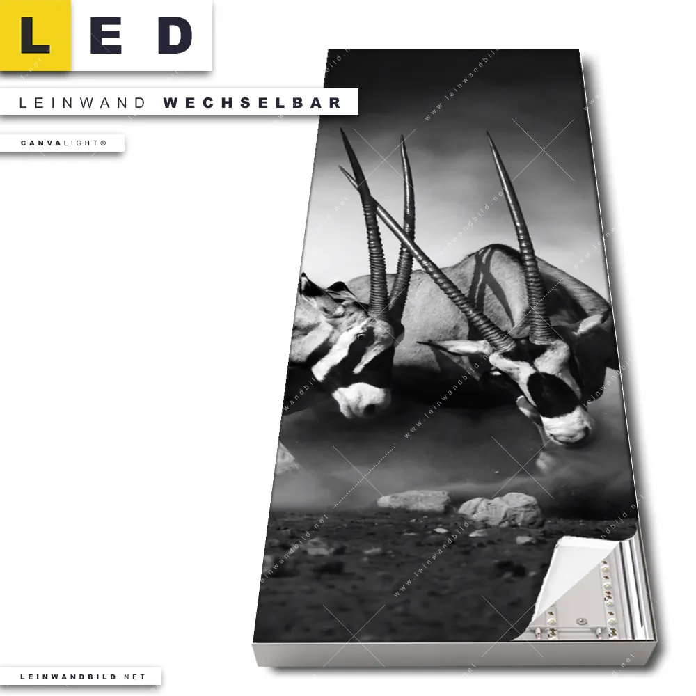 Du bist auf der Suche nach einem Tierwelt LED Leinwandbild im Schmalen Format? Begriffe wie Afrika, wild, Safari, Gemsen, Kampf, Duell, Staub, Hirsch haben Dich auf der Suche nach Deinem neuen XXL LED Wandbild mit wechselbarer Leinwand inspiriert? Farben wie Weiss, Schwarz dürfen auf Deinem neuen Leinwand-LED-Bild im Panorama-Hochformat nicht fehlen und Leuchtbilder im Natürlich - Realistisch, Schwarz - Weiss Stil passen perfekt zu Deinem Einrichtungsstil?