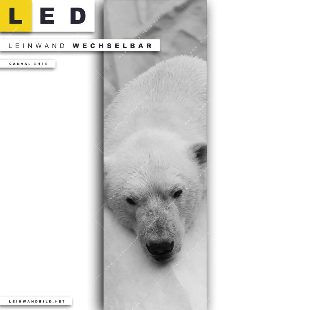 Du bist auf der Suche nach einem Tierwelt LED Leinwandbild im Schmalen Format? Begriffe wie Eisbär, Bär, weiss, kalt, Schnee, Winter haben Dich auf der Suche nach Deinem neuen XXL LED Wandbild mit wechselbarer Leinwand inspiriert? Farben wie Weiss dürfen auf Deinem neuen Leinwand-LED-Bild im Panorama-Hochformat nicht fehlen und Leuchtbilder im Schwarz - Weiss, Natürlich - Realistisch Stil passen perfekt zu Deinem Einrichtungsstil?