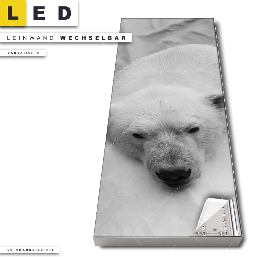 Du konfigurierst Dein individuelles LED Leinwandbild Canvalight® TEX | Der Eisbär | Schmal und wir produzieren es NEU für Dich. Unsere Tierwelt LED Bilder mit wechselbarer Textil-Leinwand sind KEINE Lagerware. Du bist Dir unsicher, welches Motiv oder Format das richtige für dein individuelles Canvalight® Leuchtbild ist, dann helfen wir dir gerne weiter und beraten dich!