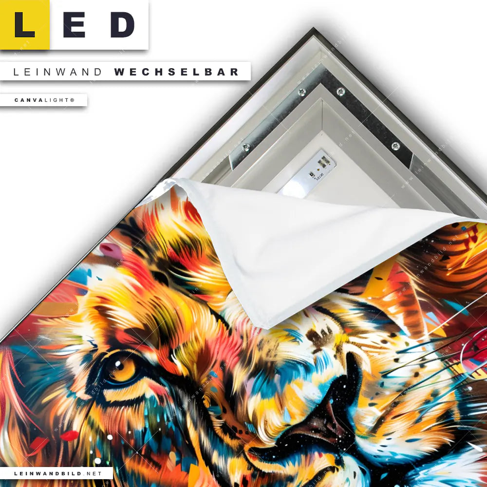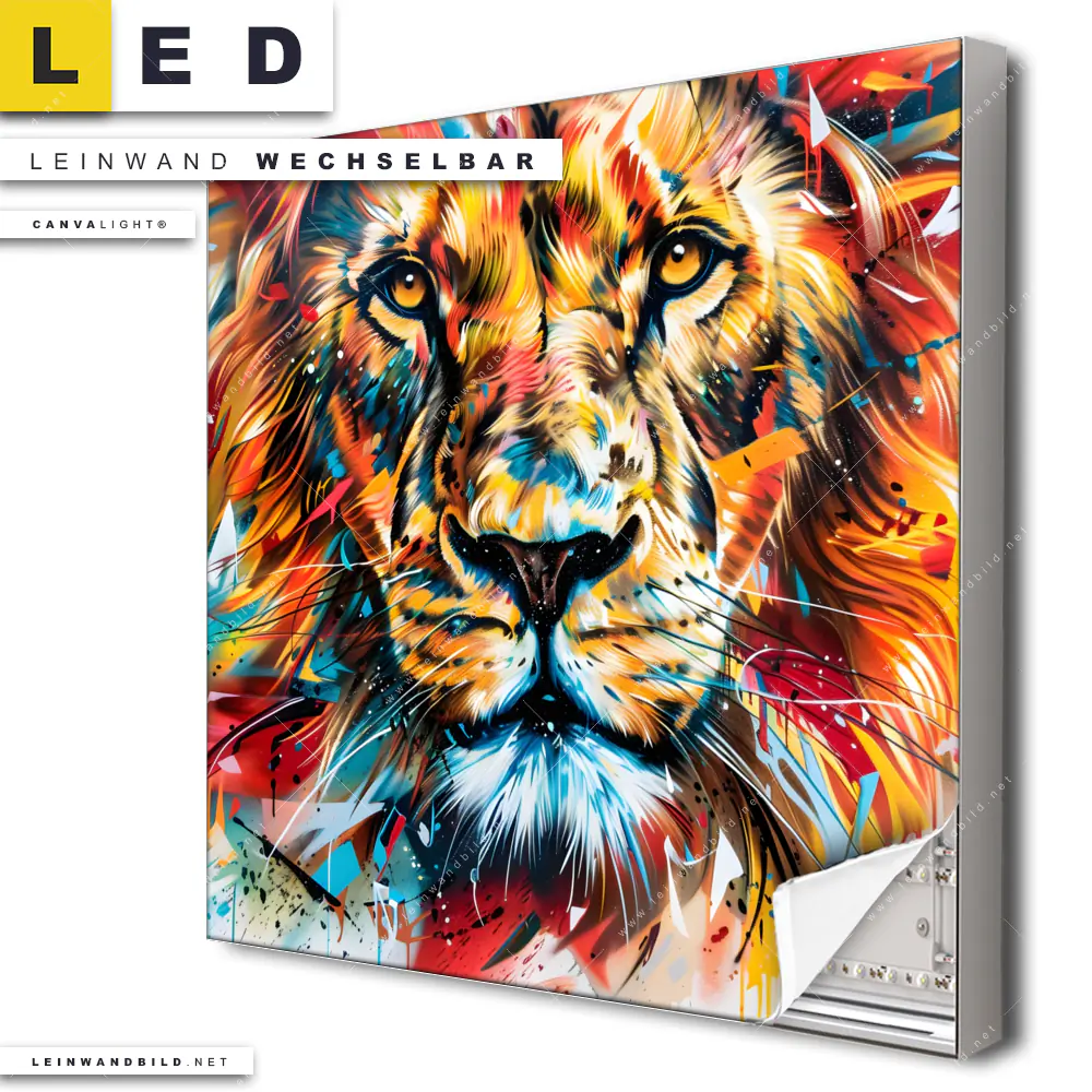 Du konfigurierst Dein individuelles LED Leinwandbild Canvalight® TEX | Der Löwe - Urban Style | Quadrat und wir produzieren es NEU für Dich. Unsere Tierwelt LED Bilder mit wechselbarer Textil-Leinwand sind KEINE Lagerware. Du bist Dir unsicher, welches Motiv oder Format das richtige für dein individuelles Canvalight® Leuchtbild ist, dann helfen wir dir gerne weiter und beraten dich!