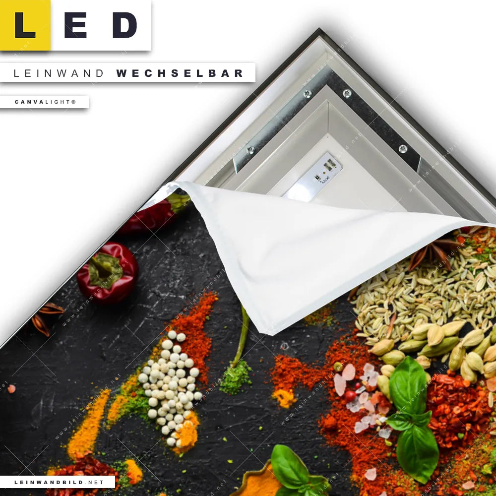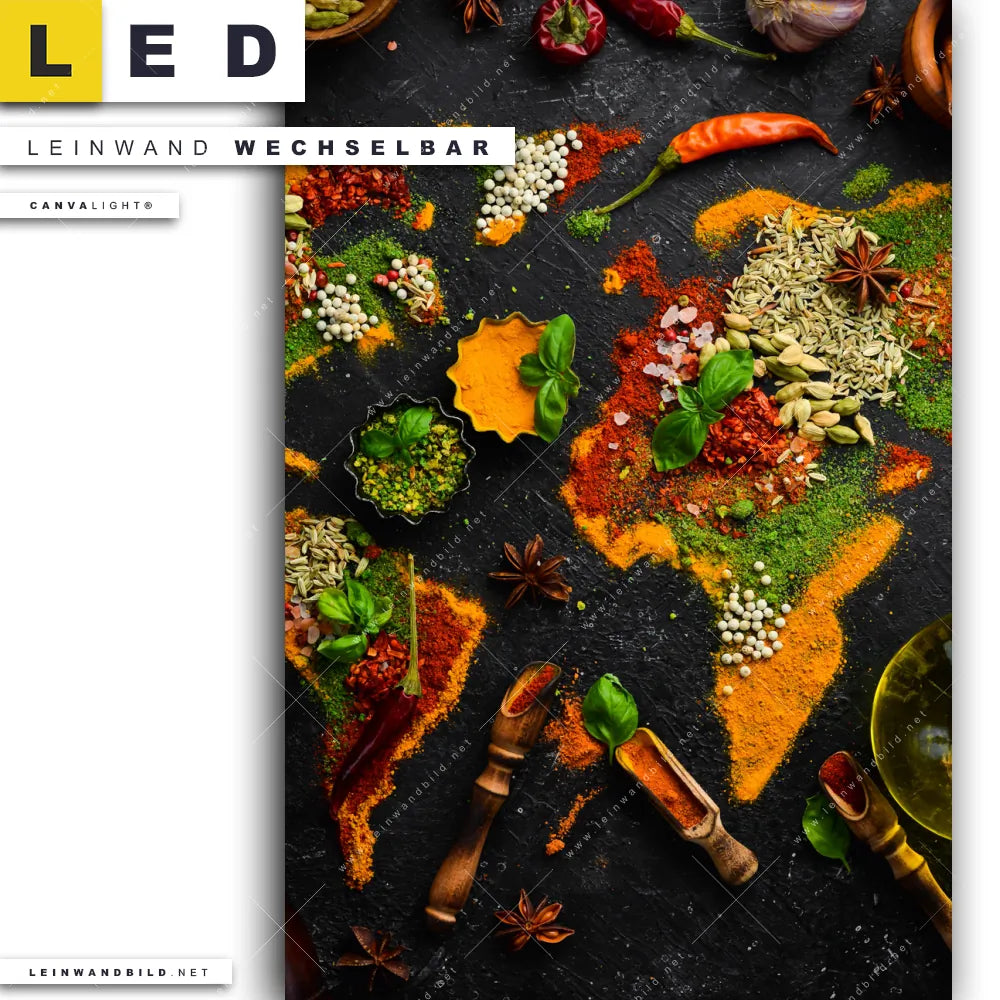 Du bist auf der Suche nach einem Essen - Trinken LED Leinwandbild im Hochformat? Begriffe wie Gewürze, Chili, Öl, Minze, Curry, Kräuter, Essen, Gesund, Pfeffermühle, Zimt, Sternanis haben Dich auf der Suche nach Deinem neuen XXL LED Wandbild mit wechselbarer Leinwand inspiriert? Farben wie Braun, Bunt, Beige, Weiss, Gelb , Grau , Grün, Hellblau, Hellgrün, Mint, Ocker, Orange, Rot, Rosa dürfen auf Deinem neuen Leinwand-LED-Bild nicht fehlen und Leuchtbilder im Natürlich - Realistisch Stil passen perfekt zu Deinem Einrichtungsstil?