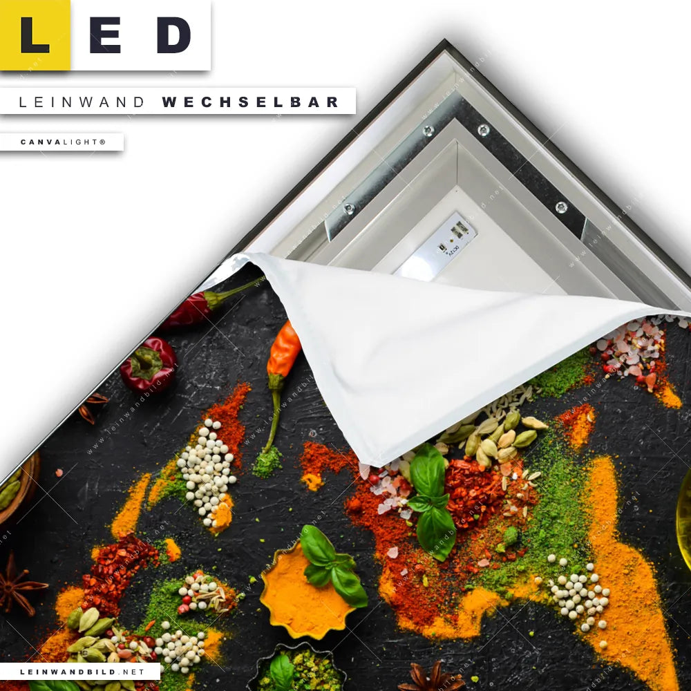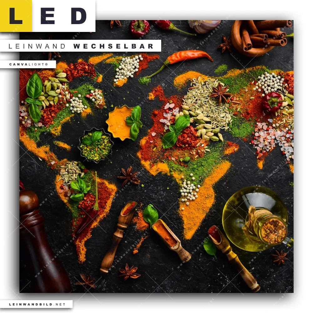Du konfigurierst Dein individuelles LED Leinwandbild Canvalight® TEX | Die Weltkarte der Gewürze | Quadrat und wir produzieren es NEU für Dich. Unsere Essen - Trinken LED Bilder mit wechselbarer Textil-Leinwand sind KEINE Lagerware. Du bist Dir unsicher, welches Motiv oder Format das richtige für dein individuelles Canvalight® Leuchtbild ist, dann helfen wir dir gerne weiter und beraten dich!