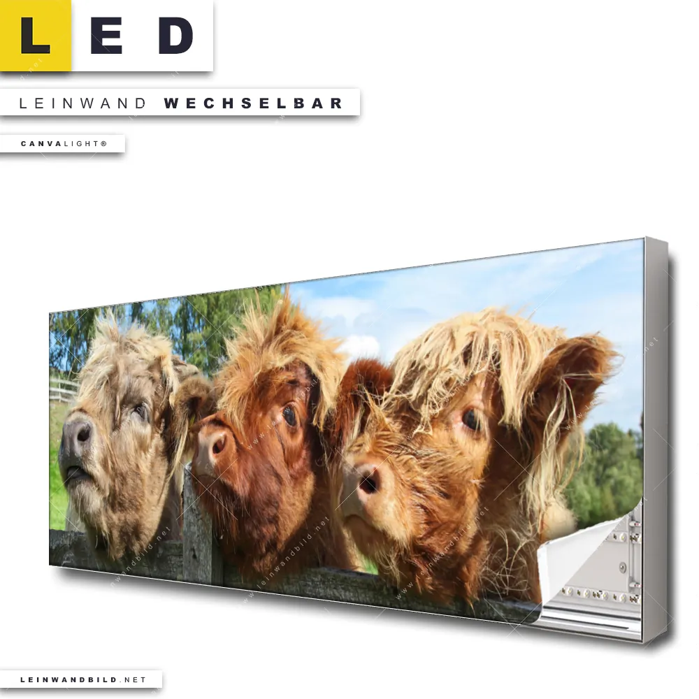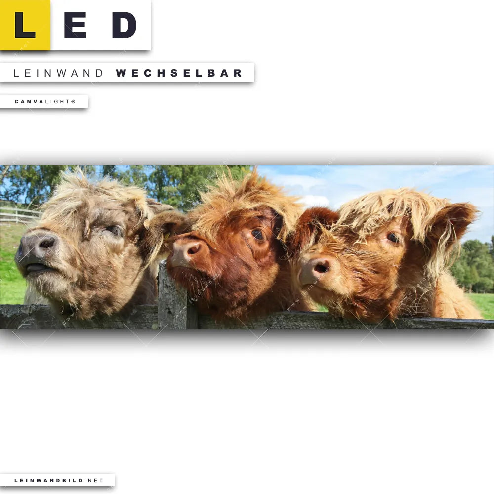 LED Leinwandbild Canvalight® TEX | Drei Schottische Rinder | Panorama