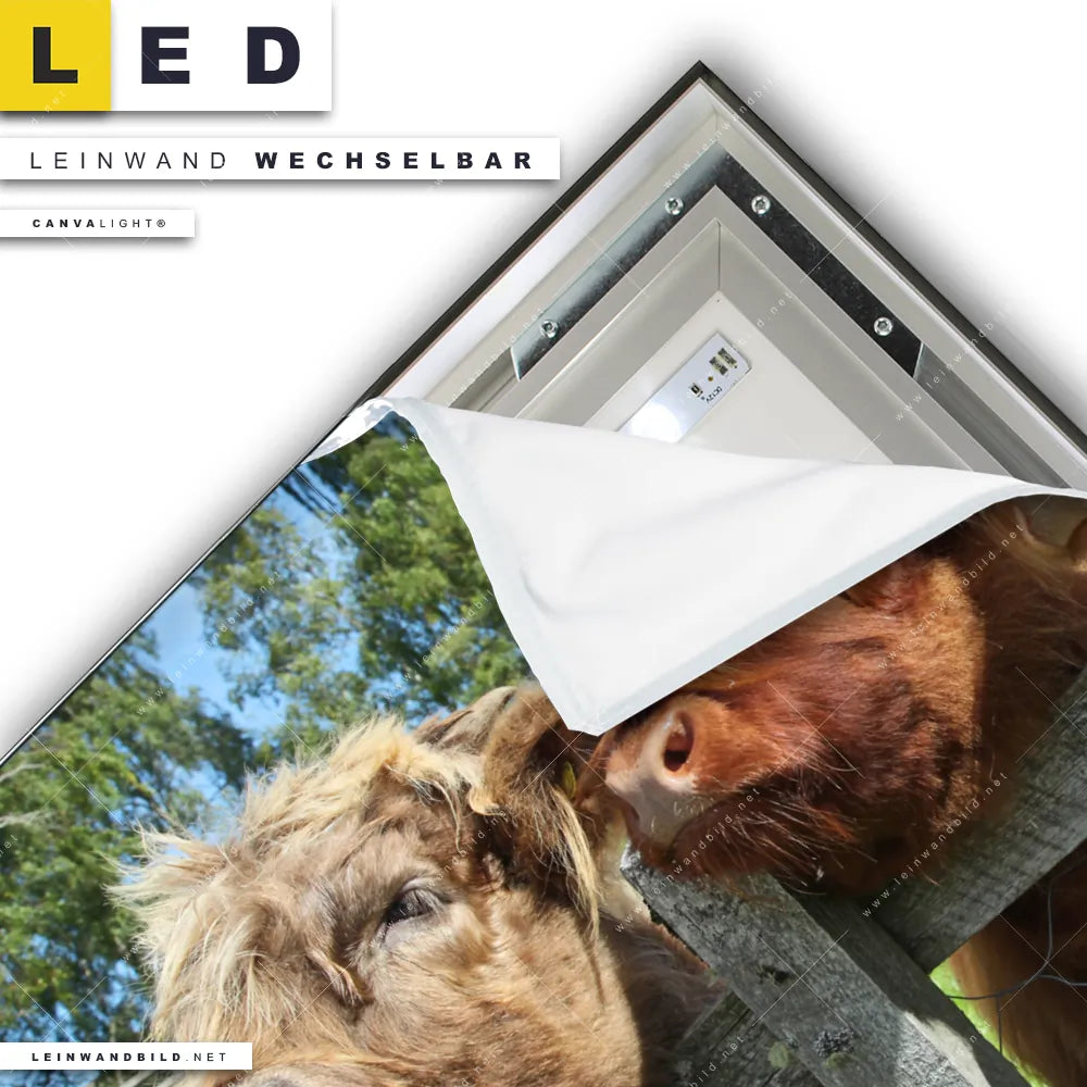 Du konfigurierst Dein individuelles LED Leinwandbild Canvalight® TEX | Drei Schottische Rinder | Quadrat und wir produzieren es NEU für Dich. Unsere Tierwelt LED Bilder mit wechselbarer Textil-Leinwand sind KEINE Lagerware. Du bist Dir unsicher, welches Motiv oder Format das richtige für dein individuelles Canvalight® Leuchtbild ist, dann helfen wir dir gerne weiter und beraten dich!