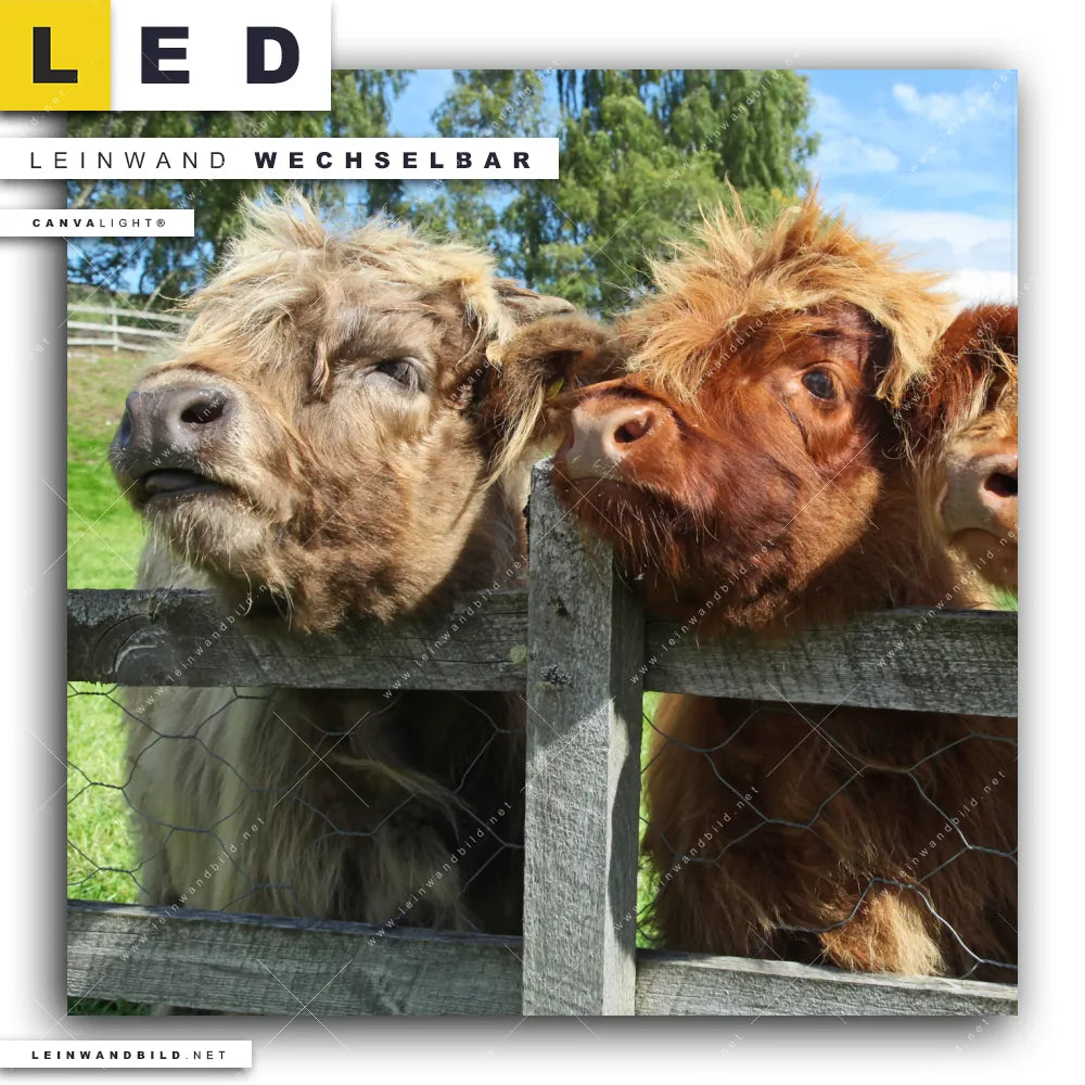 Dann sollte das LED Leinwandbild Canvalight® TEX | Drei Schottische Rinder | Quadrat den Weg zu Dir finden. Das stufenlos dimmbare Leinwandbild Rinder schauen über Zaun im steckerfertigen Leuchtrahmen mit Fernbedienung und optionaler Farbtemperatursteuerung fügt sich als Eye-Catcher harmonisch in jedes Bar - Gastronomie, Wohnzimmer - Schlafzimmer, Arzt - Praxis, Büro - Kanzlei Raumkonzept ein.