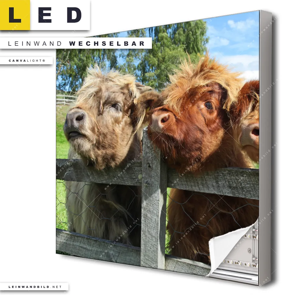 LED Leinwandbild Canvalight® TEX | Drei Schottische Rinder | Quadrat
