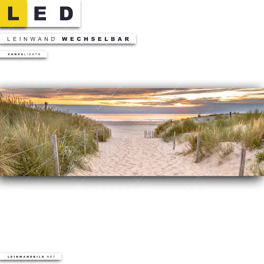 Du bist auf der Suche nach einem Strand - Meer, Landschaften LED Leinwandbild im Panorama-Format? Begriffe wie Sommer, Deutschland, Dünen, Gräser, Sonnenuntergang - Sonnenaufgang, Ostsee - Nordsee, Urlaub - Reisen, Strandweg haben Dich auf der Suche nach Deinem neuen XXL LED Wandbild mit wechselbarer Leinwand inspiriert? Farben wie Grün, Beige, Hellblau, Orange dürfen auf Deinem neuen extra breiten Leinwand-LED-Bild nicht fehlen und Leuchtbilder im Natürlich - Realistisch Stil passen perfekt zu Deinem Einrichtungsstil?