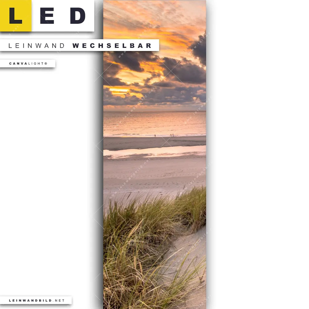 Du bist auf der Suche nach einem Strand - Meer, Landschaften LED Leinwandbild im Schmalen Format? Begriffe wie Sommer, Deutschland, Dünen, Gräser, Ostsee - Nordsee, Urlaub - Reisen, Sonnenuntergang - Sonnenaufgang haben Dich auf der Suche nach Deinem neuen XXL LED Wandbild mit wechselbarer Leinwand inspiriert? Farben wie Grün, Beige dürfen auf Deinem neuen Leinwand-LED-Bild im Panorama-Hochformat nicht fehlen und Leuchtbilder im Natürlich - Realistisch Stil passen perfekt zu Deinem Einrichtungsstil?