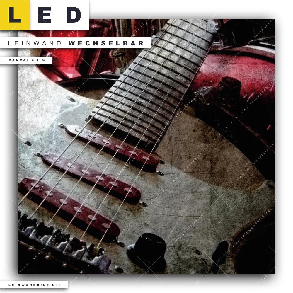 Du bist auf der Suche nach einem Porträts - Menschen LED Leinwandbild im Quadratischen Format? Begriffe wie Musik, Gitarre, Instrument, Strom, Elektrizität haben Dich auf der Suche nach Deinem neuen XXL LED Wandbild mit wechselbarer Leinwand inspiriert? Farben wie Rot, Schwarz, Weiss dürfen auf Deinem neuen Leinwand-LED-Bild nicht fehlen und Leuchtbilder im Retro - Vintage, Modern Art Stil passen perfekt zu Deinem Einrichtungsstil?