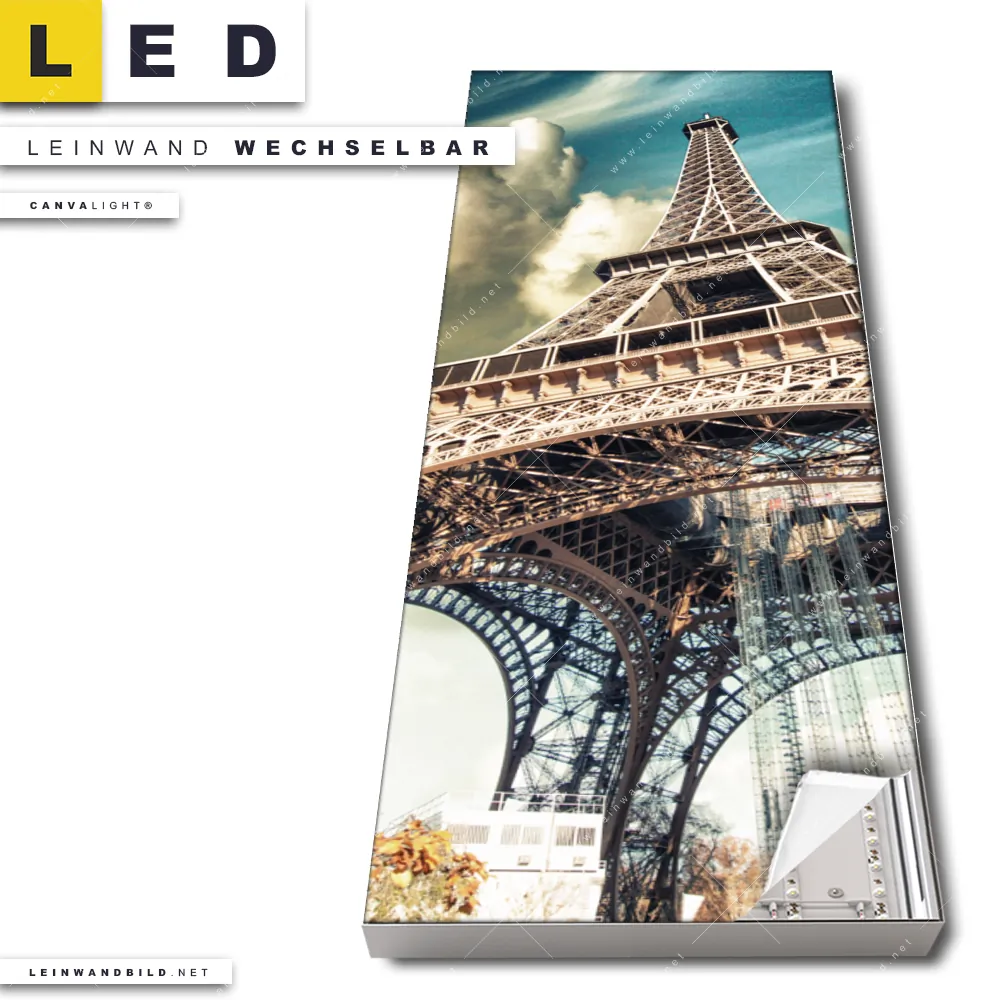 Du konfigurierst Dein individuelles LED Leinwandbild Canvalight® TEX | Eifelturm in Paris | Schmal und wir produzieren es NEU für Dich. Unsere Architektur - Gebäude, Städte - Skylines, Landschaften LED Bilder mit wechselbarer Textil-Leinwand sind KEINE Lagerware. Du bist Dir unsicher, welches Motiv oder Format das richtige für dein individuelles Canvalight® Leuchtbild ist, dann helfen wir dir gerne weiter und beraten dich!