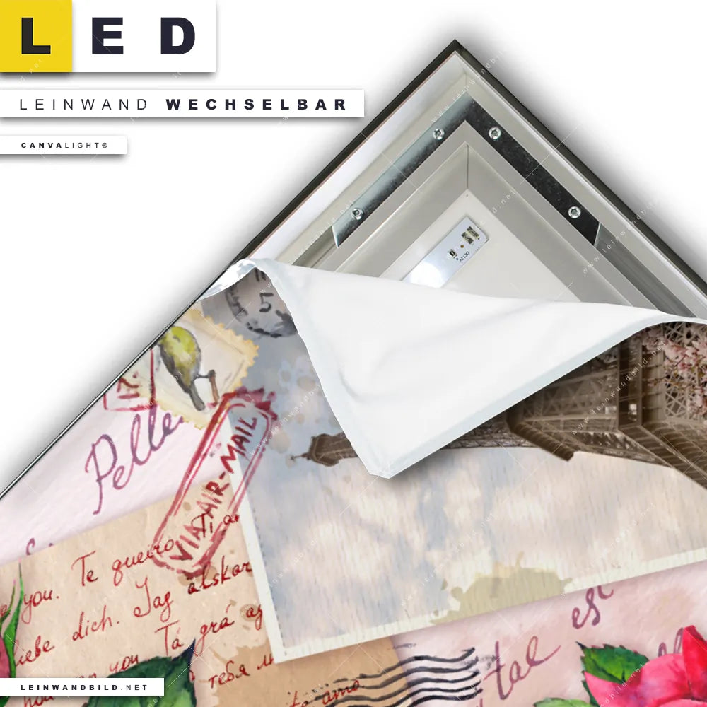 Bitte beachte, dass die Farben, der auf dem Monitor abgebildeten Liebesbriefe aus Paris Darstellung, möglicherweise von den Originalfarben deines LED Leinwandbildes abweichen können.
