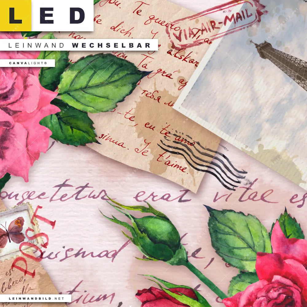 Bitte beachte, dass die Farben, der auf dem Monitor abgebildeten Liebesbriefe aus Paris Darstellung, möglicherweise von den Originalfarben deines LED Leinwandbildes abweichen können.