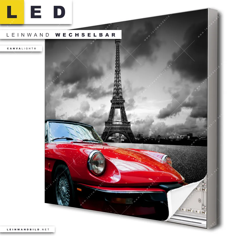 Dann sollte das LED Leinwandbild Canvalight® TEX | Eiffelturm & Rotes Auto | Quadrat den Weg zu Dir finden. Das stufenlos dimmbare Leinwandbild Sportwagen vor dem Eiffelturm im steckerfertigen Leuchtrahmen mit Fernbedienung und optionaler Farbtemperatursteuerung fügt sich als Eye-Catcher harmonisch in jedes Arzt - Praxis, Bar - Gastronomie, Büro - Kanzlei, Wohnzimmer - Schlafzimmer Raumkonzept ein.