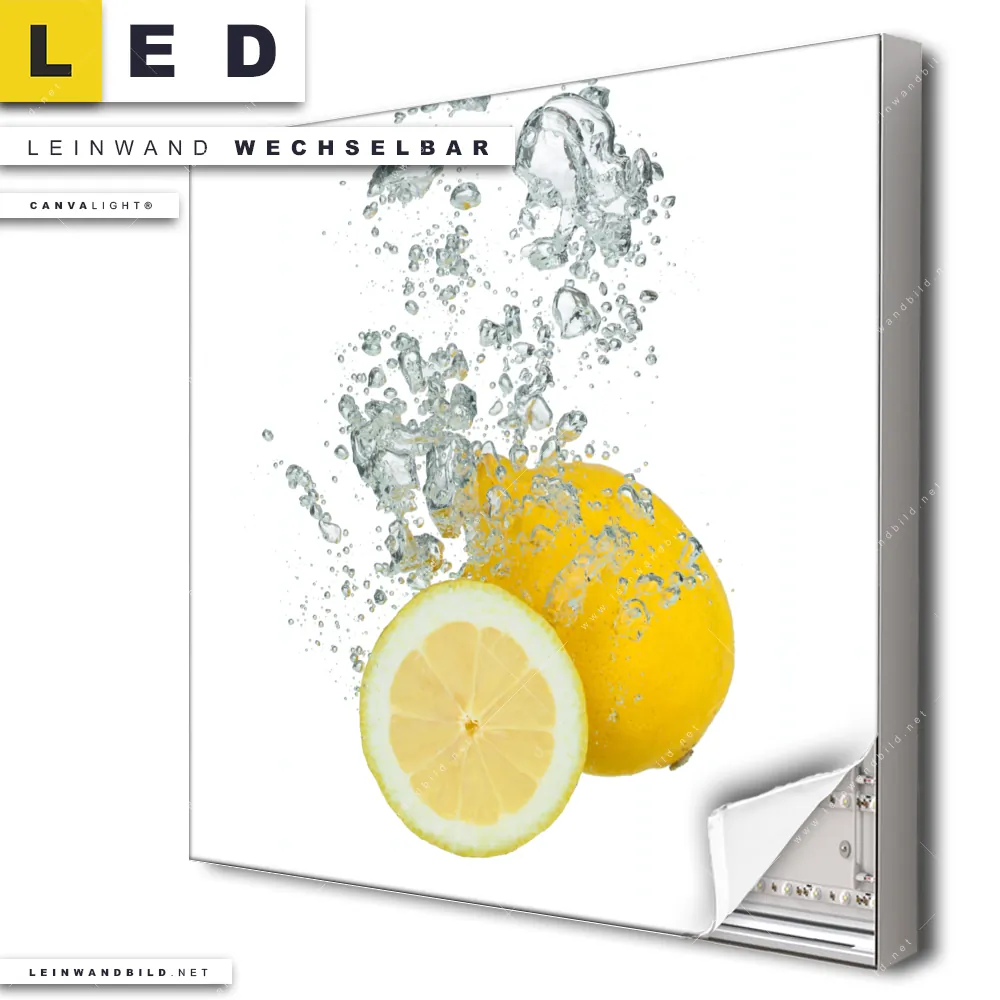 Begriffe wie Obst, zitrusfrüchte, Früchte, Wasser, Zitrone, Spritzer, spritzen, frisch, spritzig haben Dich auf der Suche nach Deinem neuen LED Wandbild mit beleuchteter Leinwand inspiriert? Dann sollte das LED Bild frische Zitronen mit austauschbarer Textil-Fotoleinwand den Weg zu Dir finden.