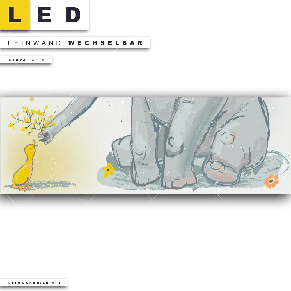 Du bist auf der Suche nach einem Tierwelt LED Leinwandbild im Panorama-Format? Begriffe wie Kinder, Tiere, Aquarell, Kunst, Freunde, Ente, Elefant, Blumen haben Dich auf der Suche nach Deinem neuen XXL LED Wandbild mit wechselbarer Leinwand inspiriert? Farben wie Orange, Gelb , Grau dürfen auf Deinem neuen extra breiten Leinwand-LED-Bild nicht fehlen und Leuchtbilder im Modern Art Stil passen perfekt zu Deinem Einrichtungsstil?
