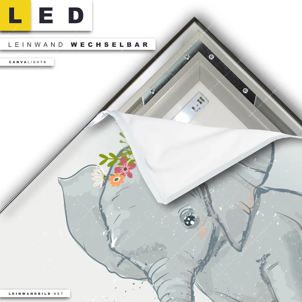 Du konfigurierst Dein individuelles LED Leinwandbild Canvalight® TEX | Elefant & Entlein | Quadrat und wir produzieren es NEU für Dich. Unsere Tierwelt LED Bilder mit wechselbarer Textil-Leinwand sind KEINE Lagerware. Du bist Dir unsicher, welches Motiv oder Format das richtige für dein individuelles Canvalight® Leuchtbild ist, dann helfen wir dir gerne weiter und beraten dich!
