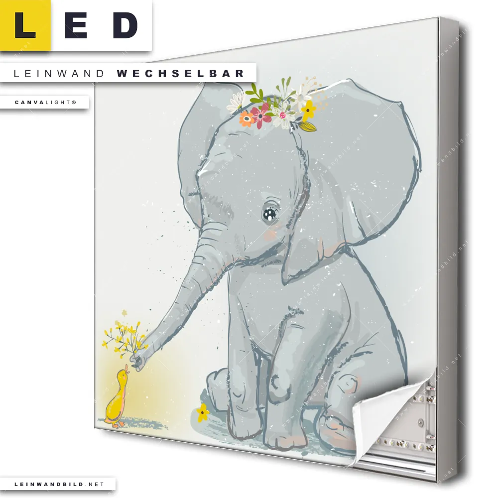 Dann sollte das LED Leinwandbild Canvalight® TEX | Elefant & Entlein | Quadrat den Weg zu Dir finden. Das stufenlos dimmbare Leinwandbild Elefant schenkt Ente Blumen im steckerfertigen Leuchtrahmen mit Fernbedienung und optionaler Farbtemperatursteuerung fügt sich als Eye-Catcher harmonisch in jedes Kinderzimmer, Arzt - Praxis, Friseur - Beauty Raumkonzept ein.