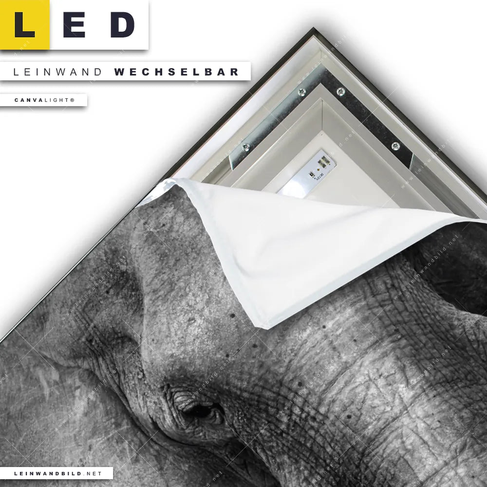 Du konfigurierst Dein individuelles LED Leinwandbild Canvalight® TEX | Elefant Schwarzweiß | Hochformat und wir produzieren es NEU für Dich. Unsere Tierwelt LED Bilder mit wechselbarer Textil-Leinwand sind KEINE Lagerware. Du bist Dir unsicher, welches Motiv oder Format das richtige für dein individuelles Canvalight® Leuchtbild ist, dann helfen wir dir gerne weiter und beraten dich!