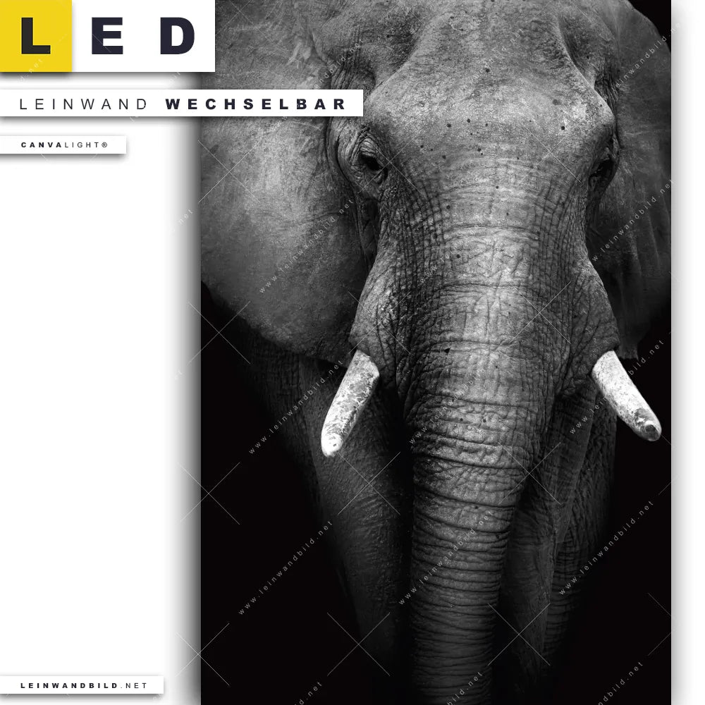 Du bist auf der Suche nach einem Tierwelt LED Leinwandbild im Hochformat? Begriffe wie Afrika, wild, Safari, Tier, Elefant haben Dich auf der Suche nach Deinem neuen XXL LED Wandbild mit wechselbarer Leinwand inspiriert? Farben wie Weiss, Schwarz dürfen auf Deinem neuen Leinwand-LED-Bild nicht fehlen und Leuchtbilder im Natürlich - Realistisch, Schwarz - Weiss Stil passen perfekt zu Deinem Einrichtungsstil?