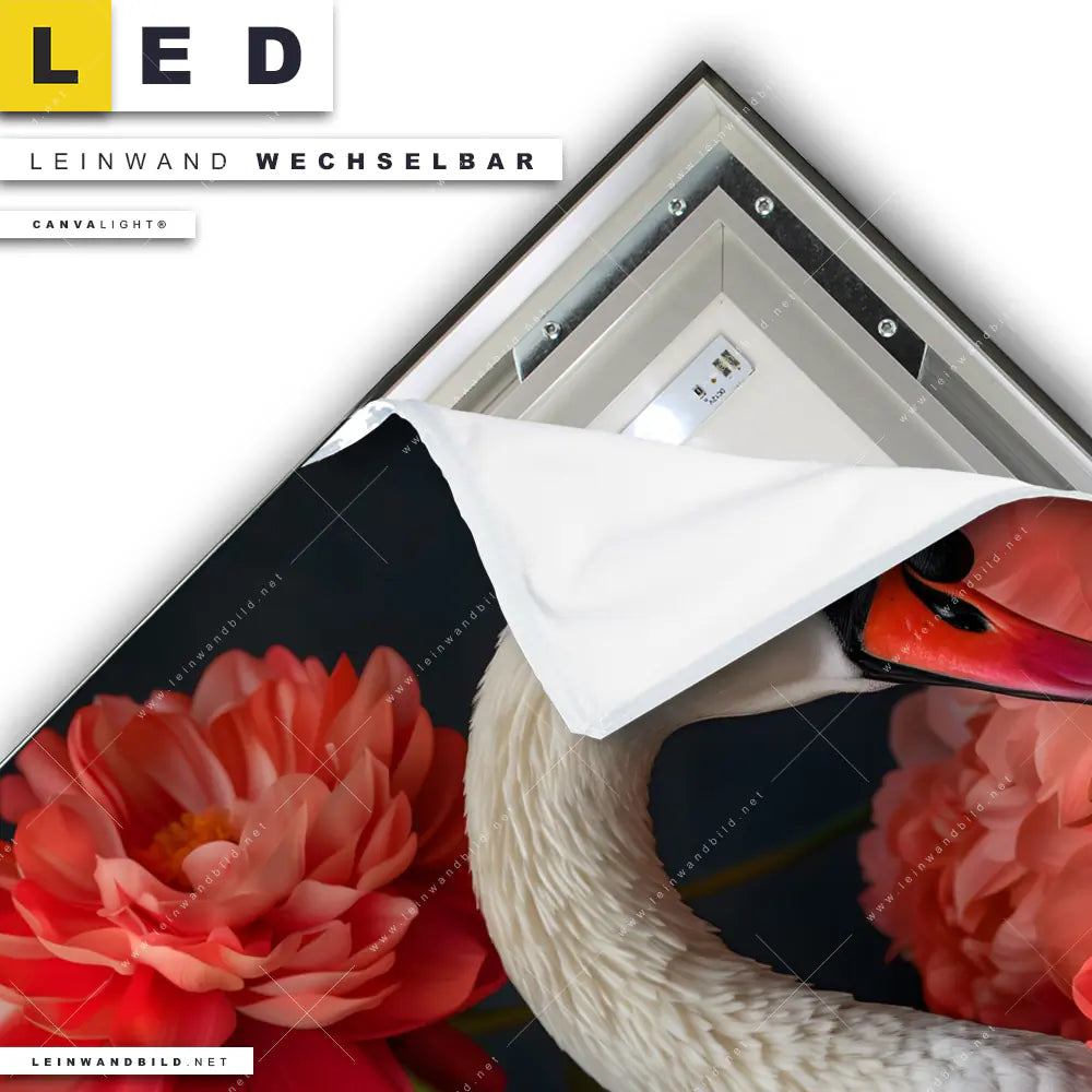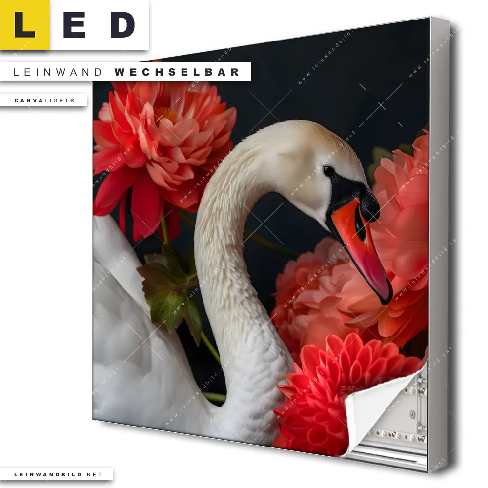 LED Leinwandbild Canvalight® TEX | Eleganter Schwan mit Blumen | Quadrat
