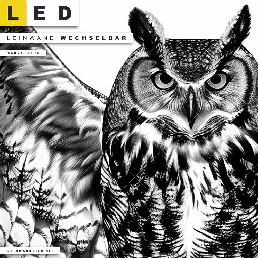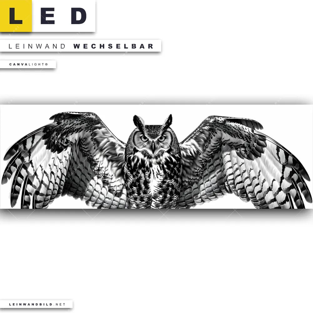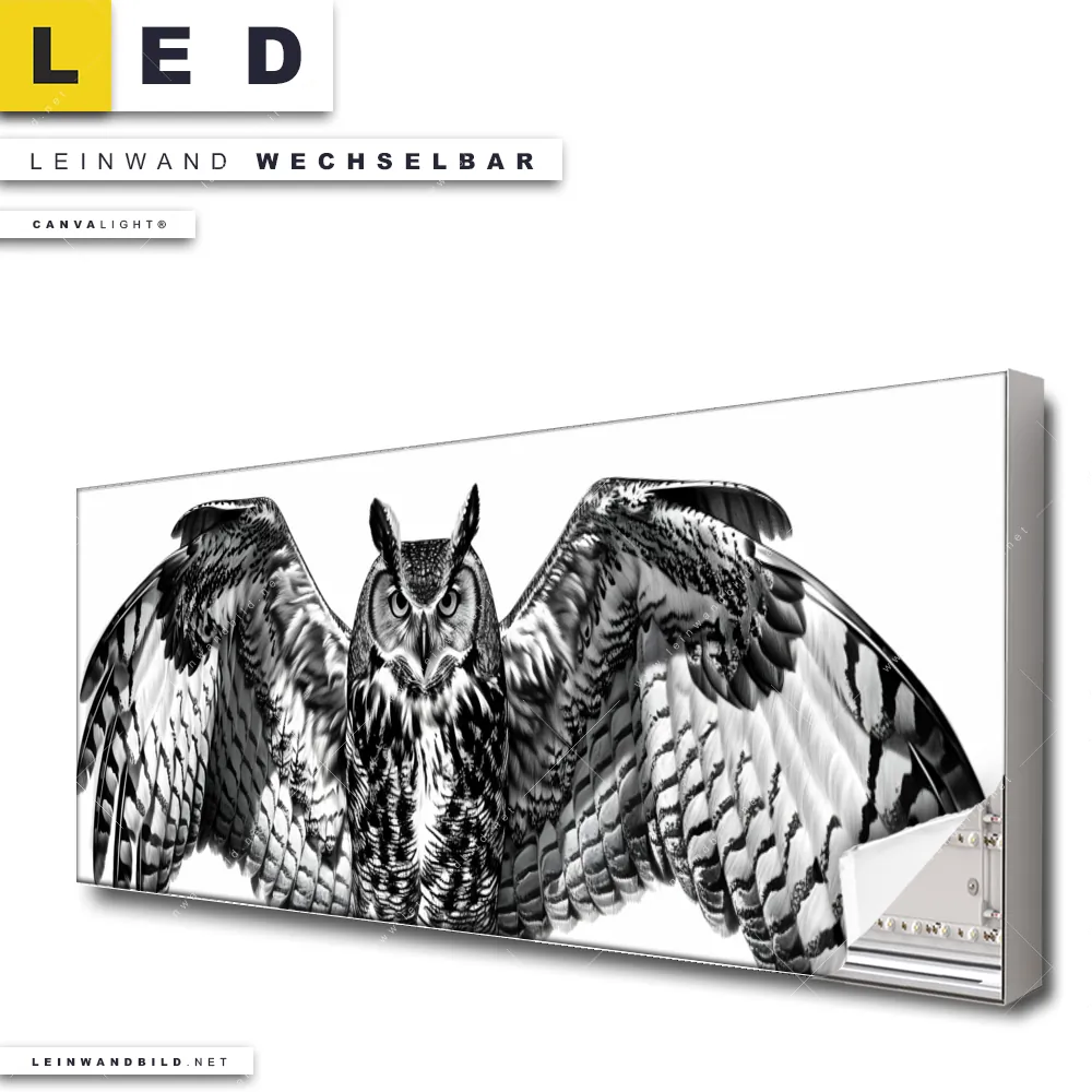 Du bist auf der Suche nach einem Tierwelt LED Leinwandbild im Panorama-Format? Begriffe wie Tierporträt, Vogel, Eule, Ast, Flügel, Tier, Uhu, Kauz haben Dich auf der Suche nach Deinem neuen XXL LED Wandbild mit wechselbarer Leinwand inspiriert? Farben wie Weiss, Schwarz dürfen auf Deinem neuen extra breiten Leinwand-LED-Bild nicht fehlen und Leuchtbilder im Minimalistisch, Schwarz - Weiss Stil passen perfekt zu Deinem Einrichtungsstil?