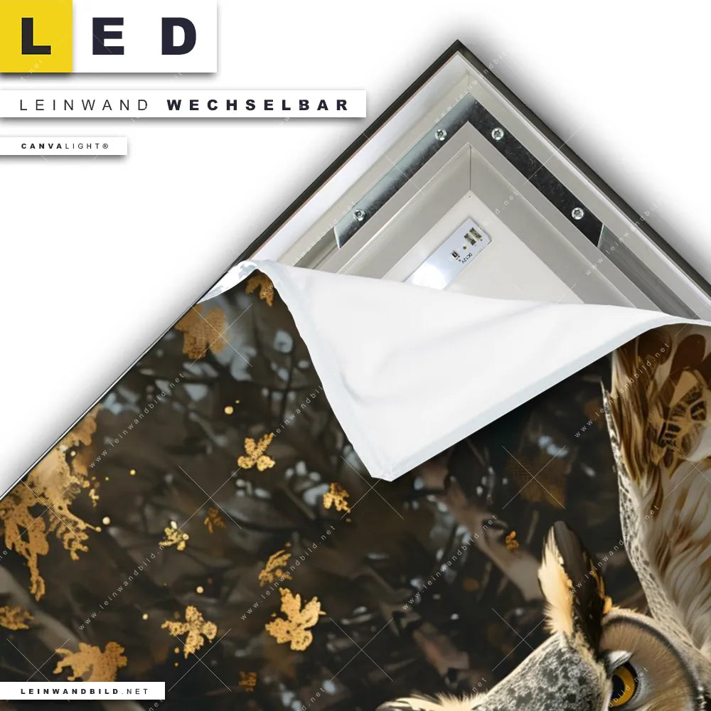 LED Leinwandbild Canvalight® TEX | Eule inmitten goldener Blätter | Hochformat