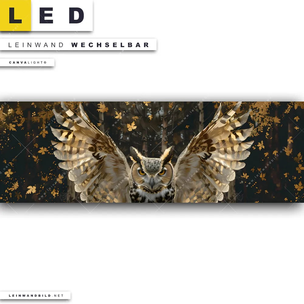LED Leinwandbild Canvalight® TEX | Eule inmitten goldener Blätter | Panorama