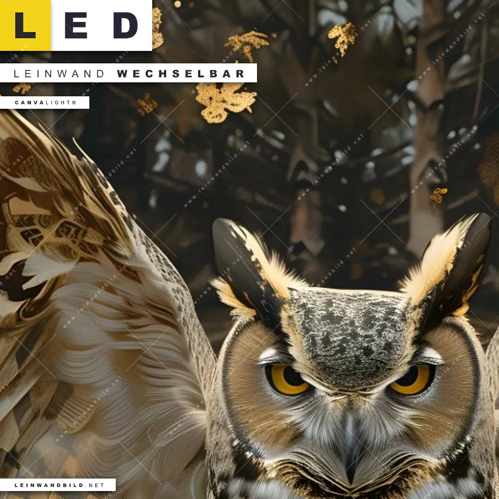 Du bist auf der Suche nach einem Tierwelt, Wald - Bäume LED Leinwandbild im Panorama-Format? Begriffe wie Tier, Vogel, Eule, Blätter, Bäume, Wald, Uhu, Kauz, Tierporträt haben Dich auf der Suche nach Deinem neuen XXL LED Wandbild mit wechselbarer Leinwand inspiriert? Farben wie Schwarz, Gold, Beige dürfen auf Deinem neuen extra breiten Leinwand-LED-Bild nicht fehlen und Leuchtbilder im Modern Art, Mixed Media Stil passen perfekt zu Deinem Einrichtungsstil?
