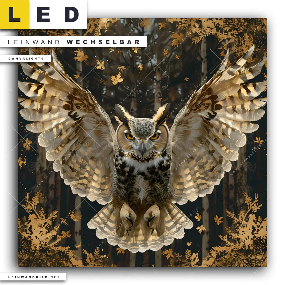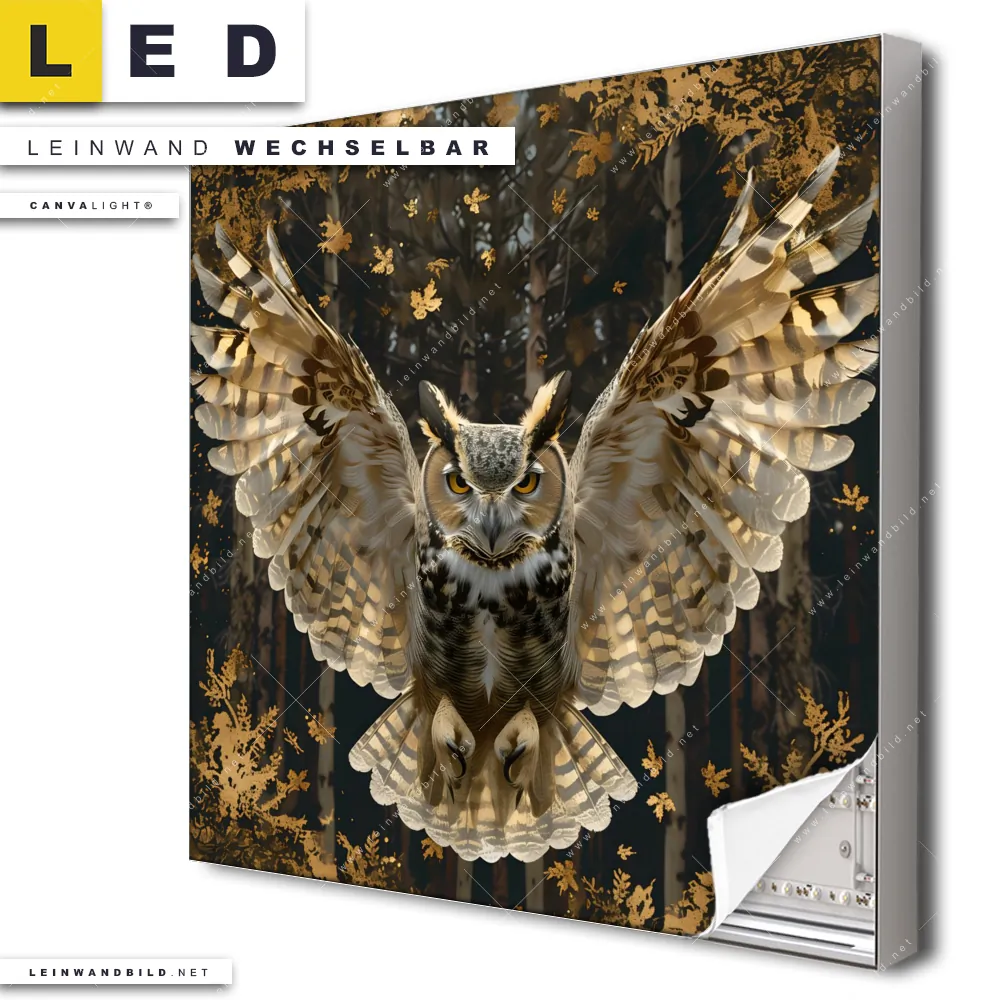 LED Leinwandbild Canvalight® TEX | Eule inmitten goldener Blätter | Quadrat