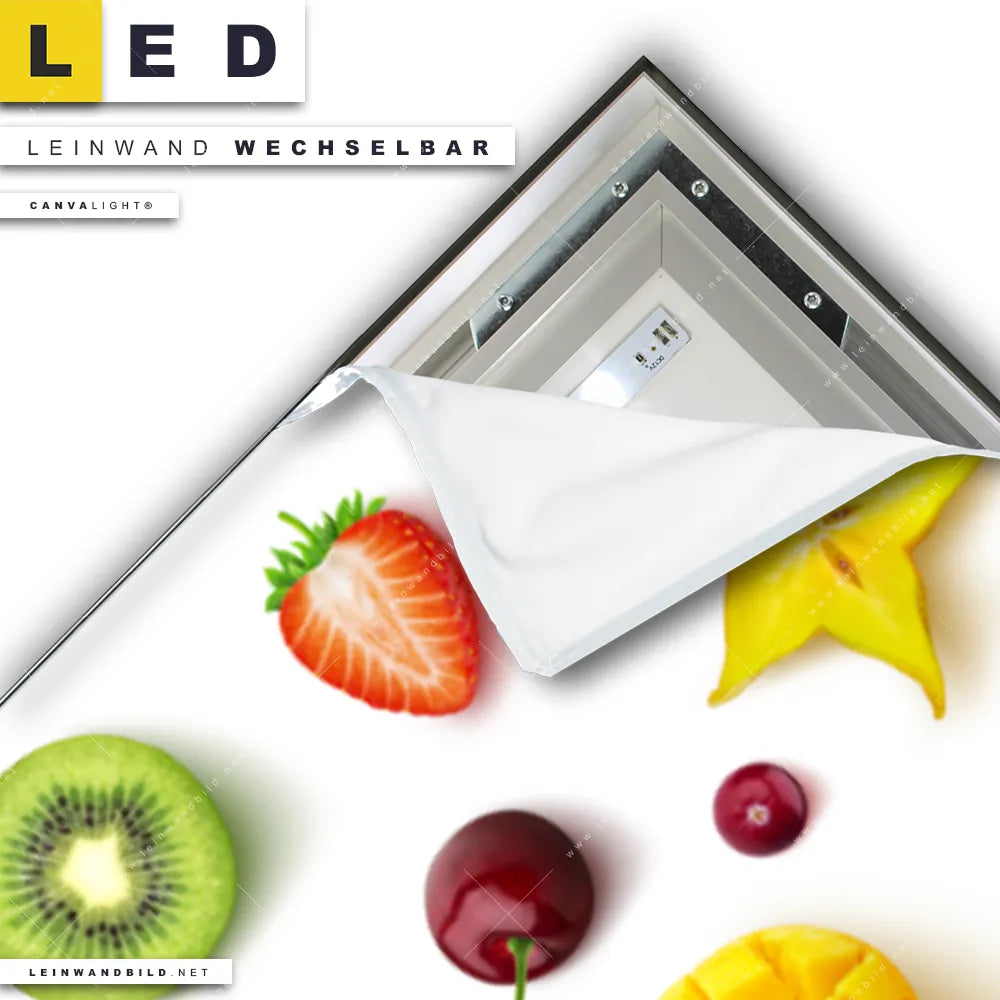 Du konfigurierst Dein individuelles LED Leinwandbild Canvalight® TEX | Exotische Früchte | Panorama und wir produzieren es NEU für Dich. Unsere Essen - Trinken LED Bilder mit wechselbarer Textil-Leinwand sind KEINE Lagerware. Du bist Dir unsicher, welches Motiv oder Format das richtige für dein individuelles Canvalight® Leuchtbild ist, dann helfen wir dir gerne weiter und beraten dich!