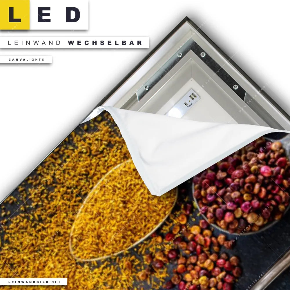 Du konfigurierst Dein individuelles LED Leinwandbild Canvalight® TEX | Exotische Gewürze auf Löffeln | Schmal und wir produzieren es NEU für Dich. Unsere Essen - Trinken LED Bilder mit wechselbarer Textil-Leinwand sind KEINE Lagerware. Du bist Dir unsicher, welches Motiv oder Format das richtige für dein individuelles Canvalight® Leuchtbild ist, dann helfen wir dir gerne weiter und beraten dich!