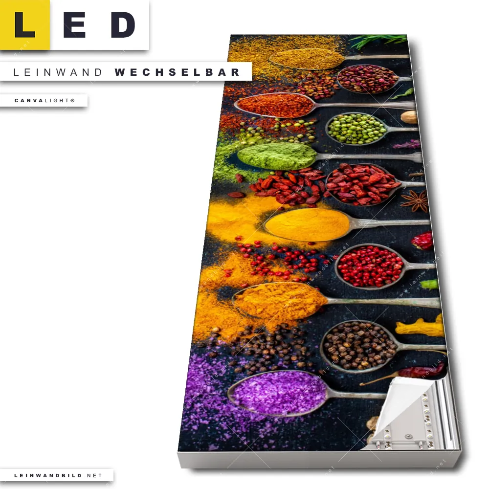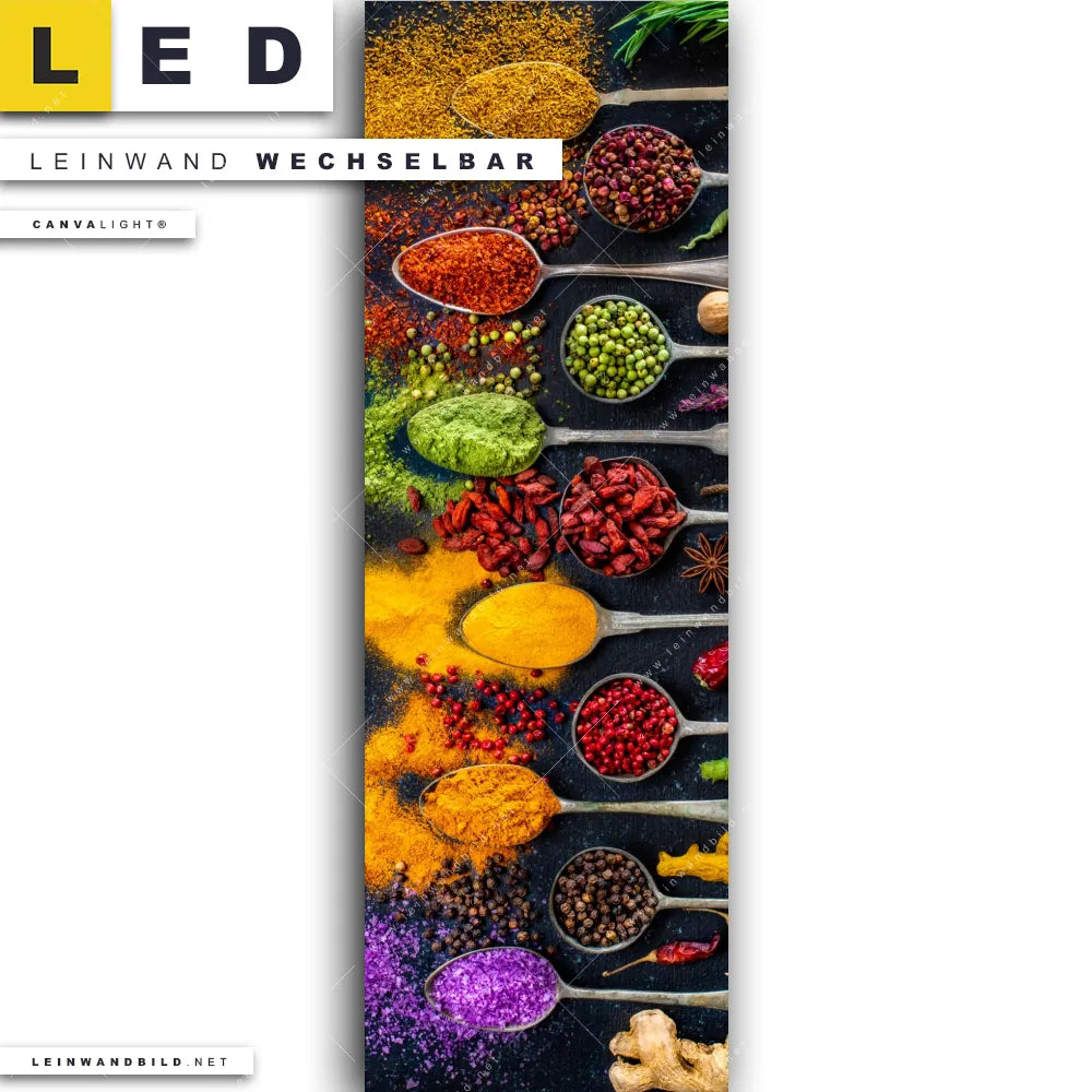 Du bist auf der Suche nach einem Essen - Trinken LED Leinwandbild im Schmalen Format? Begriffe wie Gewürze, Kräuter, Löffel, lecker, Pulver, Pfeffer, Chili, Besteck haben Dich auf der Suche nach Deinem neuen XXL LED Wandbild mit wechselbarer Leinwand inspiriert? Farben wie Schwarz, Bunt dürfen auf Deinem neuen Leinwand-LED-Bild im Panorama-Hochformat nicht fehlen und Leuchtbilder im Modern Art, Natürlich - Realistisch Stil passen perfekt zu Deinem Einrichtungsstil?