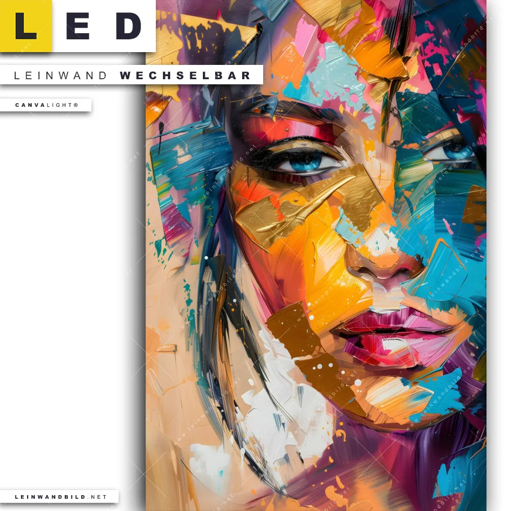 Du bist auf der Suche nach einem Porträts - Menschen LED Leinwandbild im Hochformat? Begriffe wie Porträt, Frau, Gesicht, Farbexplosion, Farbspritzer, Frauenporträt haben Dich auf der Suche nach Deinem neuen XXL LED Wandbild mit wechselbarer Leinwand inspiriert? Farben wie Bunt, Orange, Blau, Pink, Gold dürfen auf Deinem neuen Leinwand-LED-Bild nicht fehlen und Leuchtbilder im Abstrakt, Modern Art Stil passen perfekt zu Deinem Einrichtungsstil?