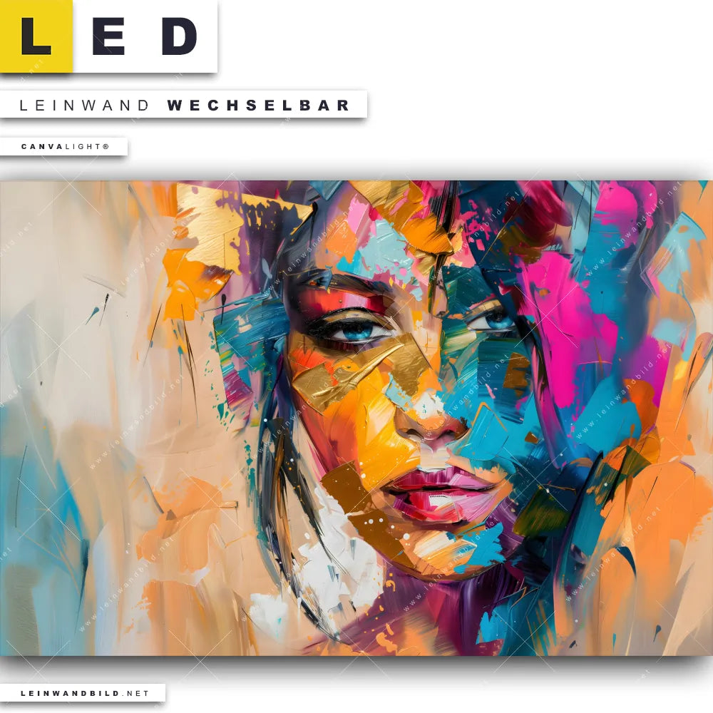 Du bist auf der Suche nach einem Porträts - Menschen LED Leinwandbild im Querformat? Begriffe wie Porträt, Frau, Gesicht, Farbexplosion, Farbspritzer, Frauenporträt haben Dich auf der Suche nach Deinem neuen XXL LED Wandbild mit wechselbarer Leinwand inspiriert? Farben wie Bunt, Orange, Blau, Pink, Gold dürfen auf Deinem neuen breiten Leinwand-LED-Bild nicht fehlen und Leuchtbilder im Abstrakt, Modern Art Stil passen perfekt zu Deinem Einrichtungsstil?